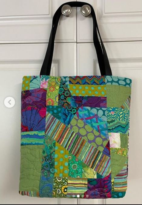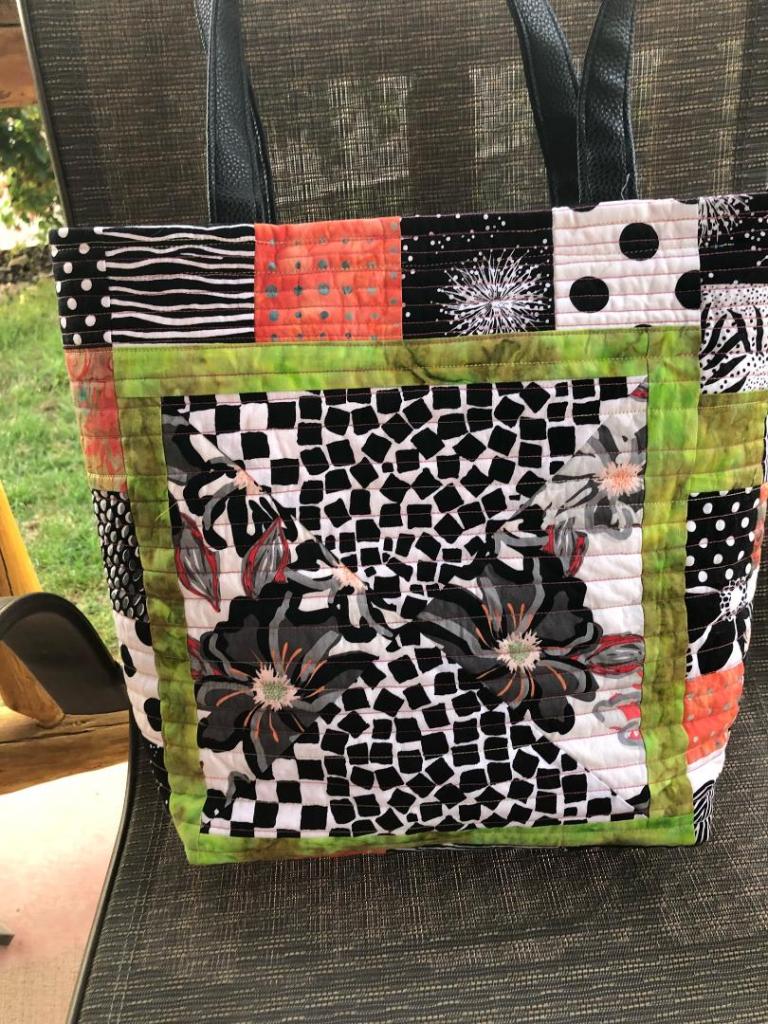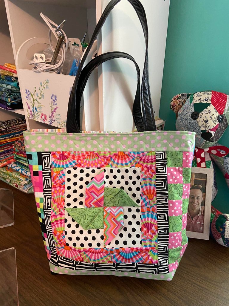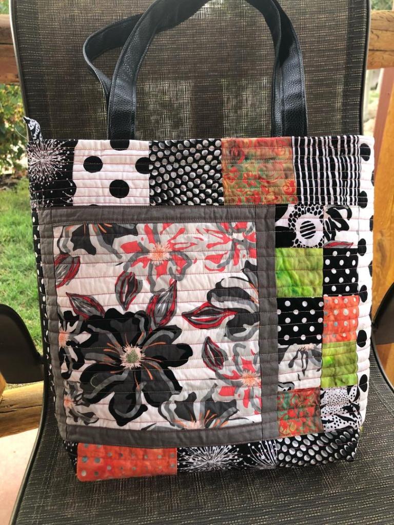 This next bag was made by Sherrit86 on Instagram. She said she’s been wanting to make one for a while. She made this from fabrics left over from a quilt. Well, I love this one! Those saturated greens with the pops of purple and turquoise… those diagonal pieces. Yummy! And guess how I feel bout that bold black and white sharks tooth. Well, you know I love it!