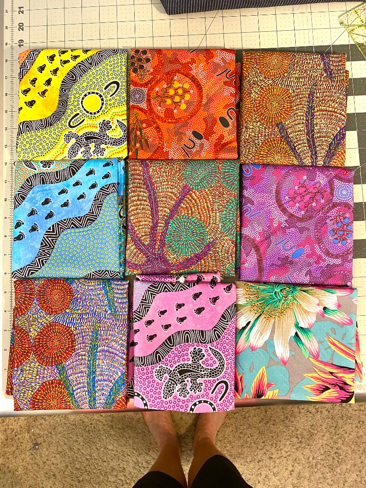 It was hot by the time I got home at noon so I sat in my living room for awhile after lunch and saw an Instagram post from a local quilt store… they had gotten a new shipment of Australian Aboriginal fabrics and the picture showed some really fun colors. So I hopped back in the car and headed out.
