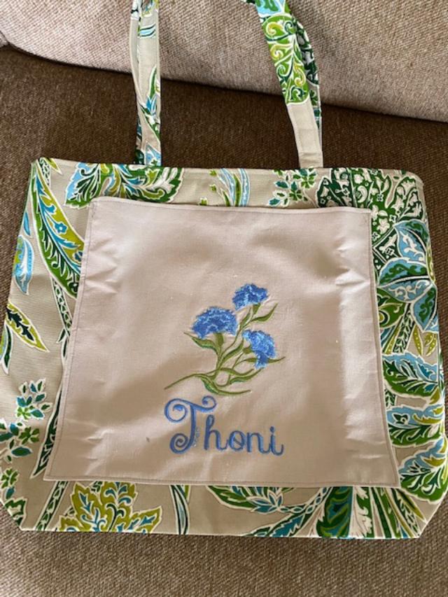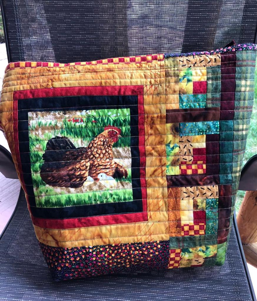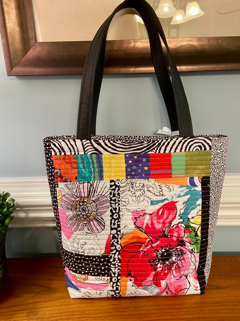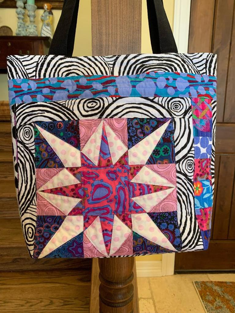 This last bag tonight was made by Gretchen Callison. She made this bag for her mom’s birthday gift. Her mom likes patchwork but Gretchen thought she might not like it on a bag. So she took a more whole cloth approach. She also changed up the handles because they are eight feet tall. What a great gif this will be!