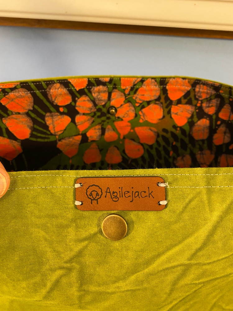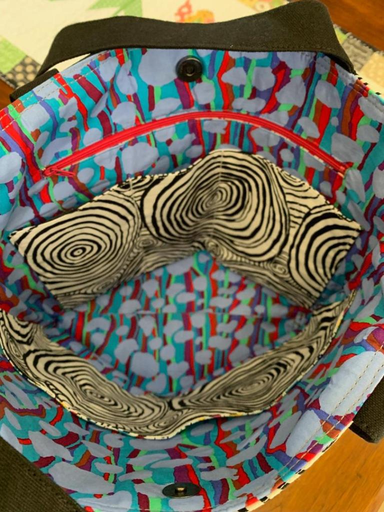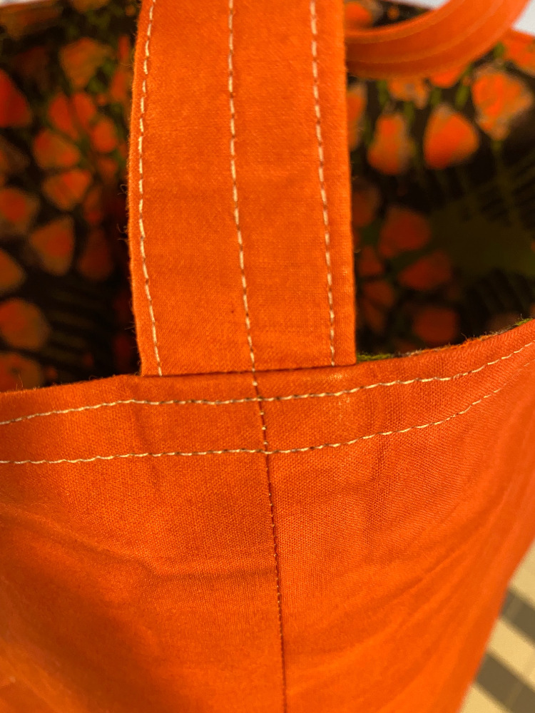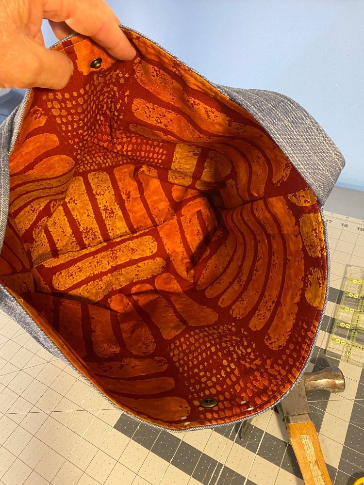 That lining fabric is one of the batiks that a co-worker brought me from her vacation in South Africa. It worked really well as a lining. It’s a pretty beefy batik so this bag is a little more substantial than the other ones I’ve made. It feels sturdy.