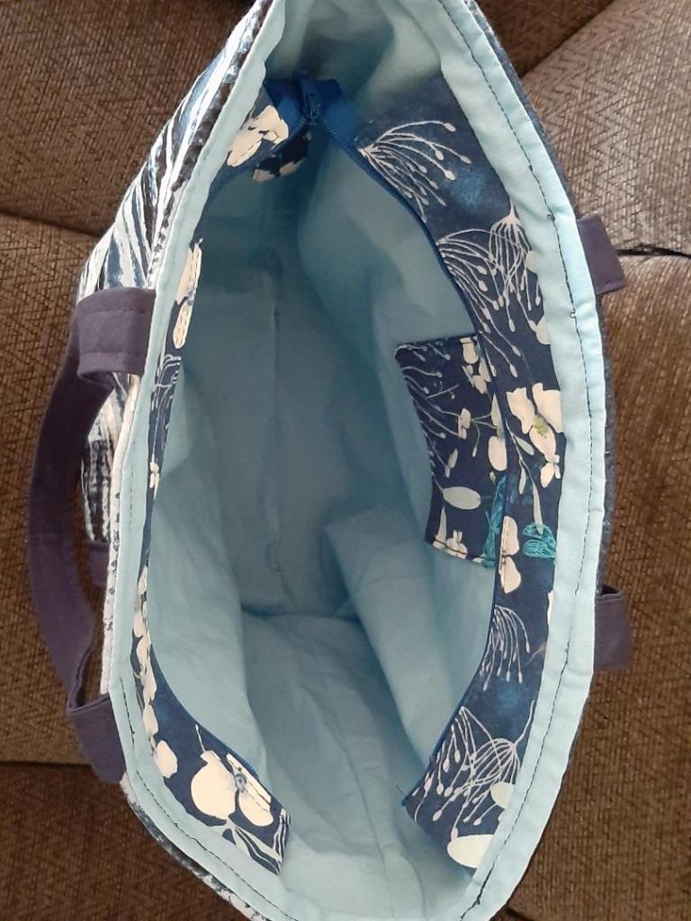 This next bag comes from Connie Collins from Ontario, Canada. She said she finally dived in and made one for herself. She completed a quilt project earlier this year and had eight blocks leftover. She didn’t know what to do with them, but when she started to read my blog, she knew exactly how they would be used. I’m glad you dived in Connie!