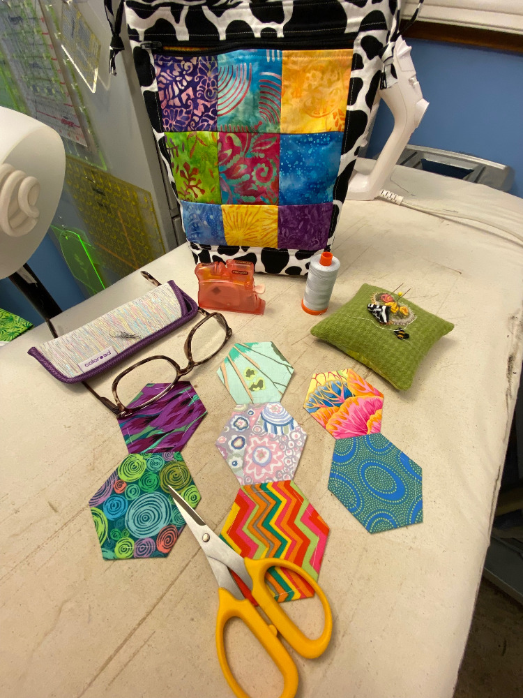 I started my day today with a 90 minute meeting that featured a long presentation. So I grabbed my hexes and did a little sewing as the meeting went on. I didn’t get much done but keeping my hands busy helped my head focus.