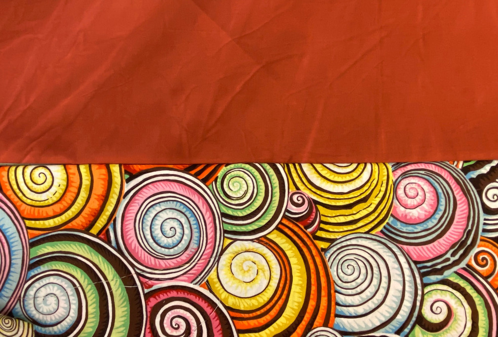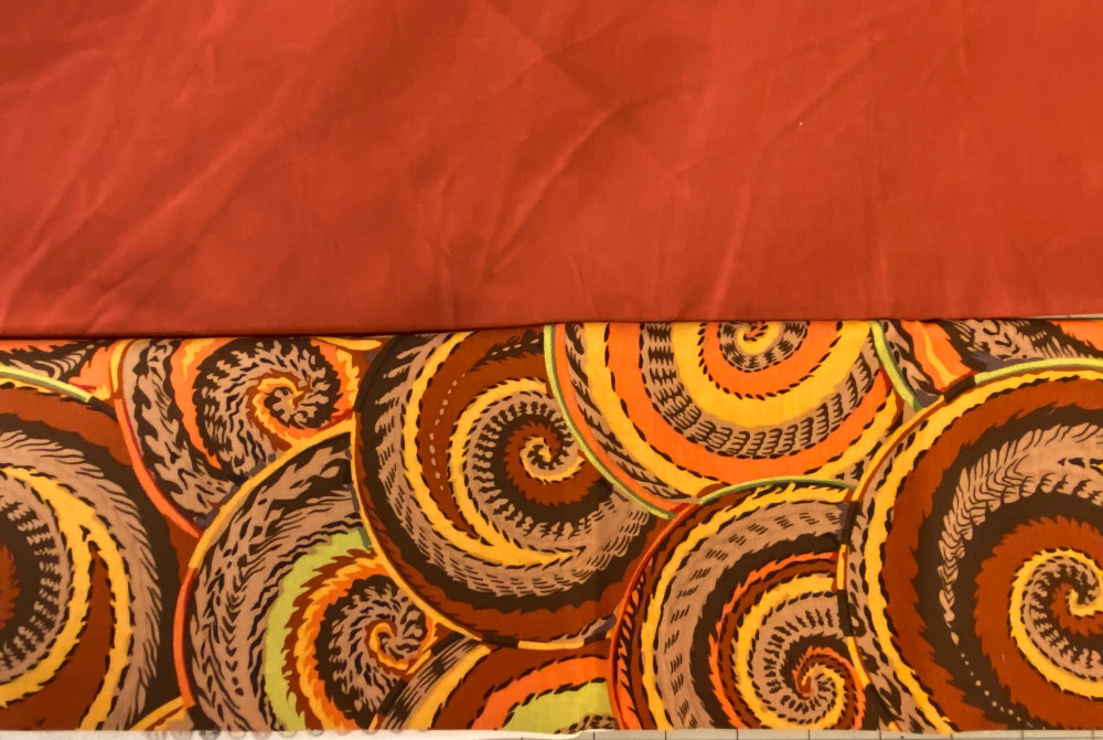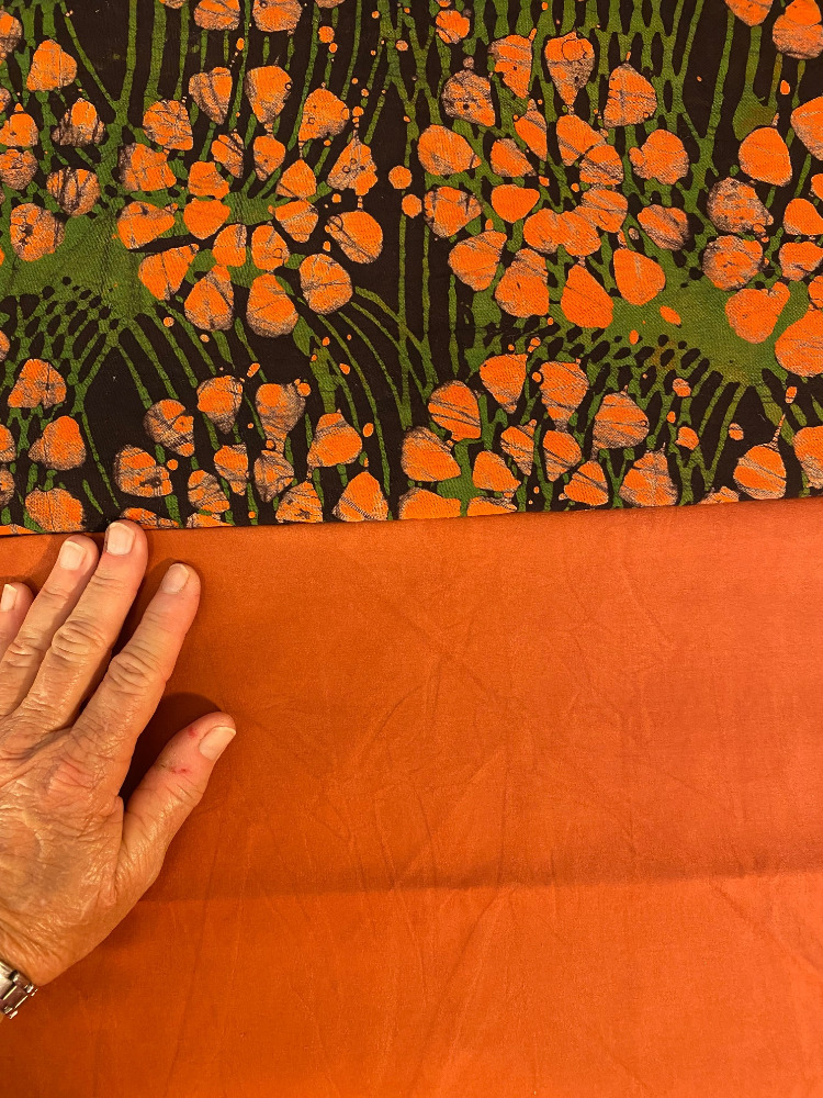 The last two, the orange and purple, are batiks that a co worker brought me from her trip to South Africa. They are batiks but they are heavier and more textured than my other batiks. She gave me two yards of each one. This seems like a good use for them.