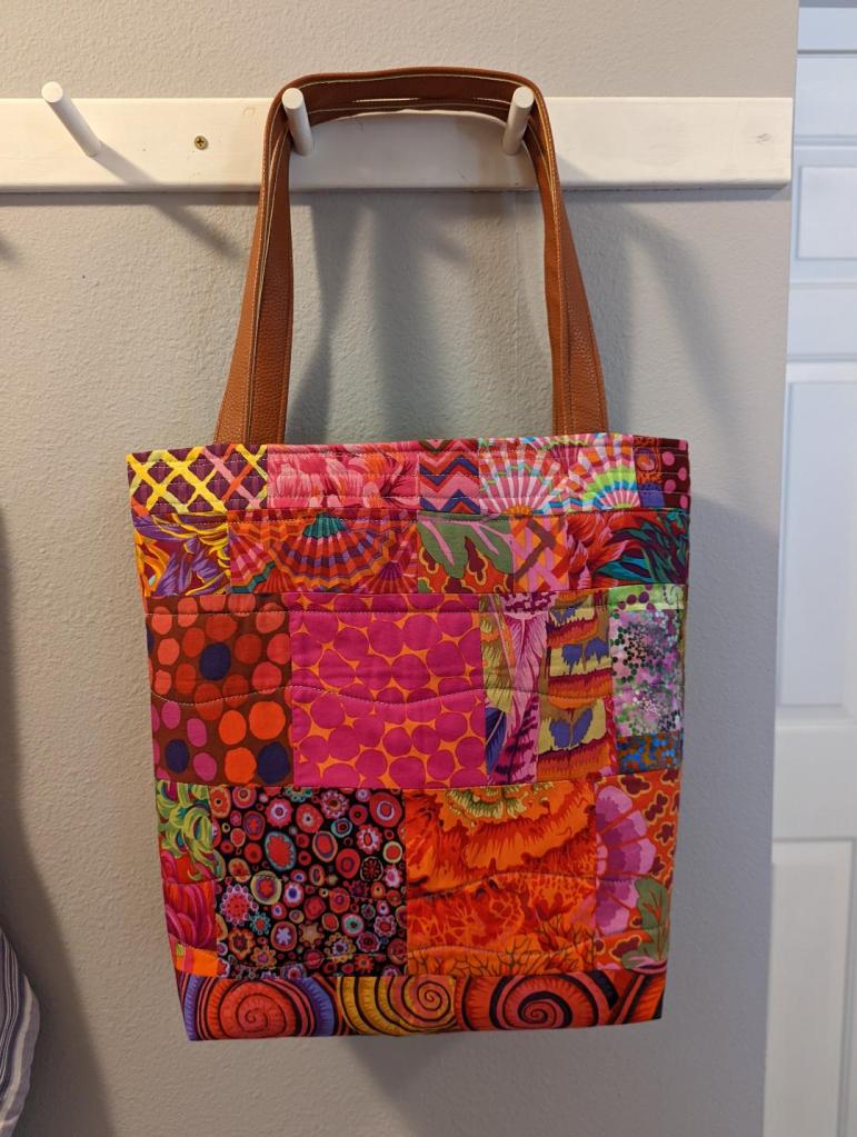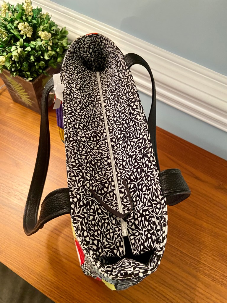 This next bag was made by Susan Conant. This is her latest Frankenbag. She said she’s addicted and loves it made with KFC fabrics. And I have to agree! It’s definitely a happy bag and makes me think of summer.