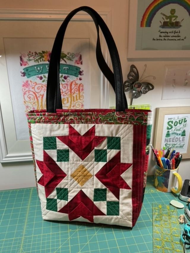 Next are these bags from Sandee Henricks. She’s really been busy. There’s Christmas everywhere! I love that great big poinsettia block and I love that she’s using up those orphan blocks.