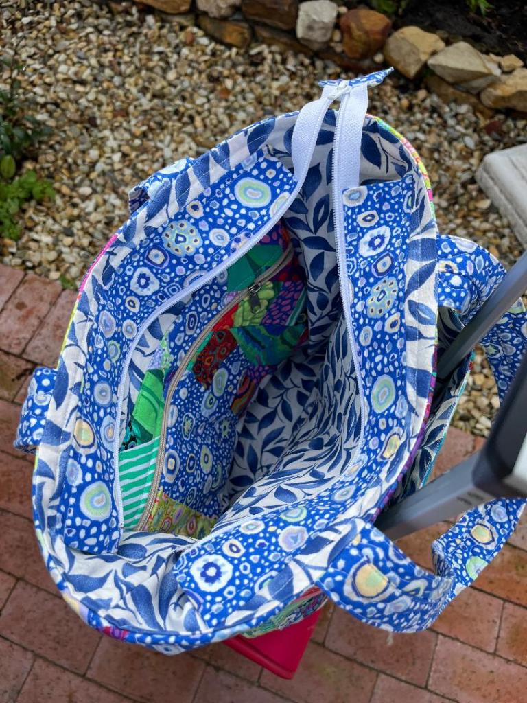 This next bag was made by Liz Arbaugh. First off, I love the colors she’s used on the outer bag. It reads purple, but there’s a lot more going on there! I just love her little fussy cut flowers. She said she made these panels in a quilt-as-you-go method, and I love the quilting that goes different directions. I just might have to make one like this before too long. She also said she tried to get one of her labradoodles to model the bag, but they didn’t want to get up off the AC vents!