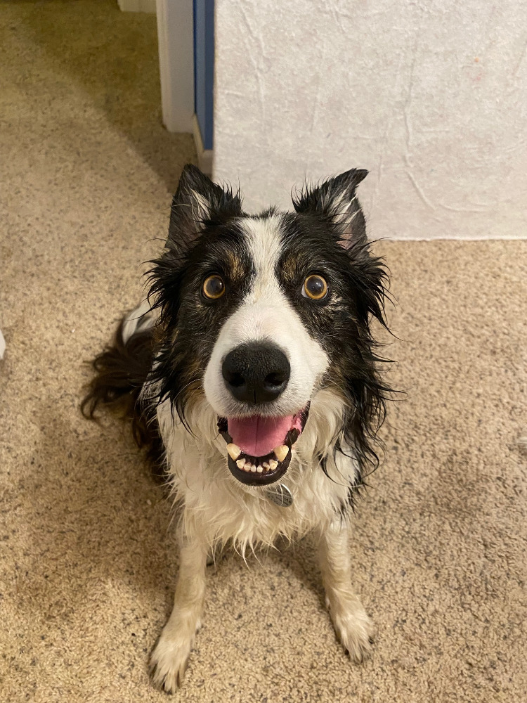 When we got home I let the dogs out into the back yard, forgetting that the sprinkler was running, and Bender came in a few minutes later soaking wet!