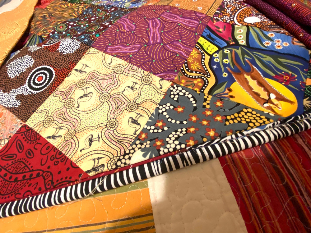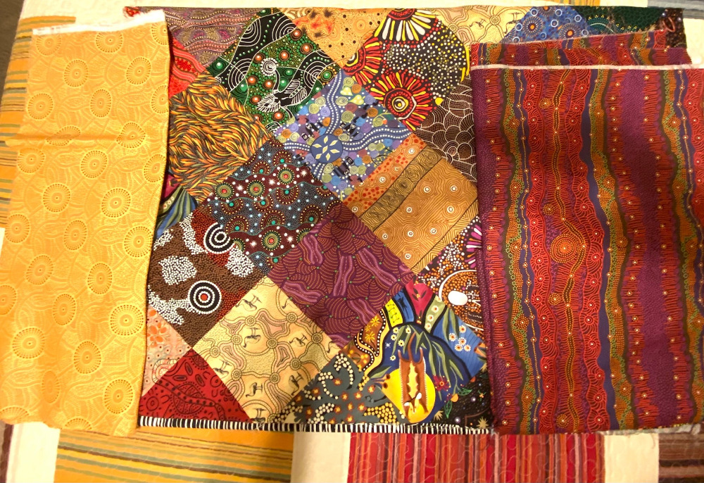 The bad news is that we’re getting a little stir crazy just hanging around in my back yard. We did go for a walk this morning after breakfast. Then I had a call I needed to sit in on. After that we hightailed it to a local fabric store to shop for some binding for one of the many (five, I think) quilts and quilt backs she brought with her to drop off with my long arm quilter. She just needed to figure out a binding for this Australian Aboriginal fabric quilt. She had brought that pale yellow fabric on the left, but I thought it was really blah. The fabric on the right is the backing.