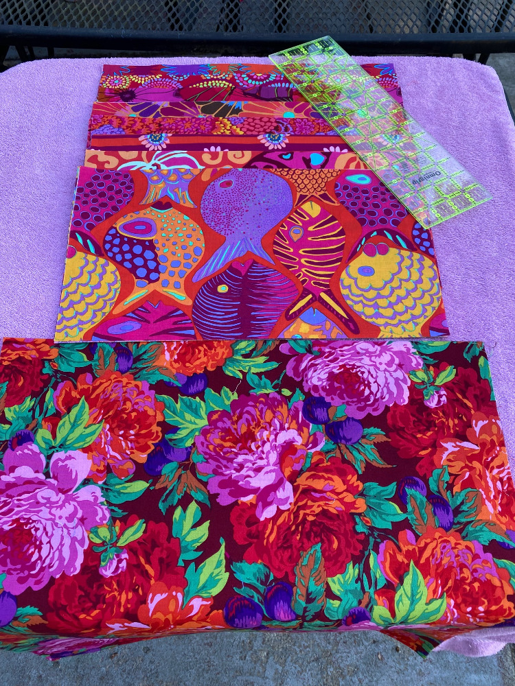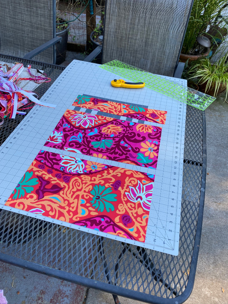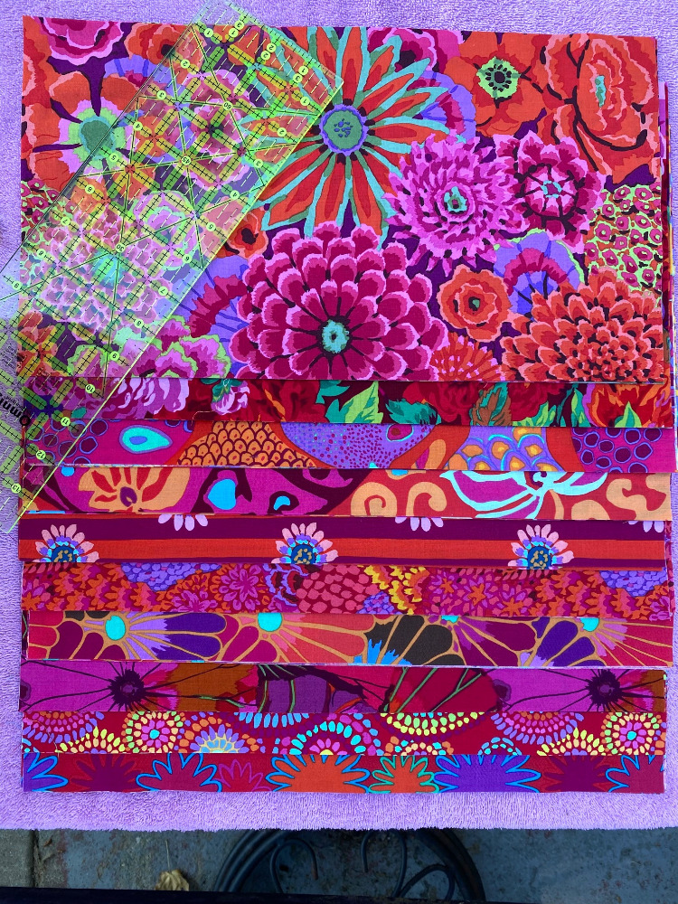My friend thought it was a great idea so we pulled my ironing board and iron out onto the patio and I brought out my cutting board, rotary cutter and rulers. But before we got started we had to pare down the red KFC fabrics I had selected. I had nearly 20 different half yards set aside for a red quilt, and we pared it down to 10 fabrics. I calculated that I would need 40 blocks for the size quilt I want, and that meant that ten half yards was nearly perfect. There was just a little waste in each piece. Good thing I have some ideas on what to do with scraps.