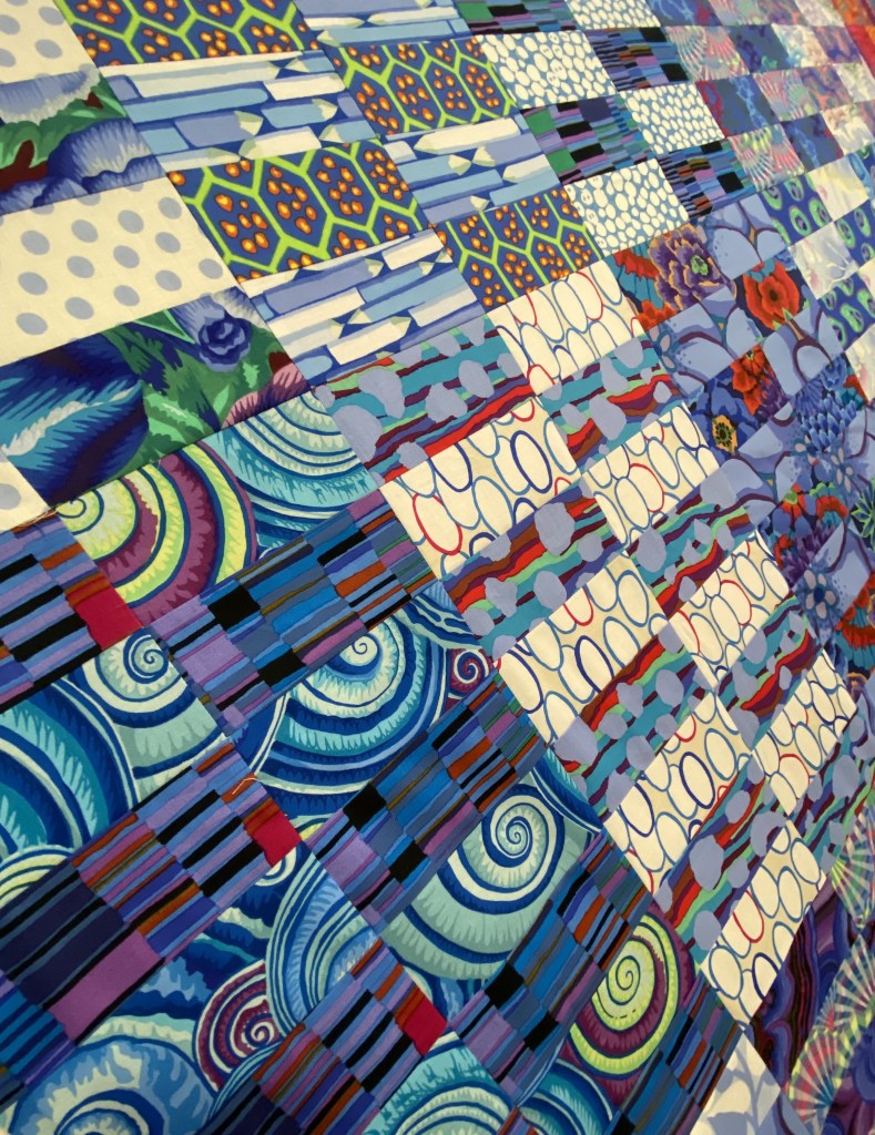 Anne – I apologize for writing so often but my head is spinning with ideas and questions (maybe nerves from my husband’s upcoming surgery) so first of all, are all the fabrics in your blue lap quilt really KFC? I’d love to find some of those white ovals with the colorful outlines and one fabric that was medium blue with red (that’s probably not an adequate description) – you don’t happen to have a list of those fabrics do you? It looks stunning!! Here’s another couple of questions. Have you ever made a quilt using the Three Layer Cake pattern (I’ll send a picture) – I’d love to do it with KFC fabrics. And have you seen the Escher quilt pattern – my husband and son are both captivated by Escher and I know there is someone that makes up kits for these using KFC- I think they are more like wall hangings and they may be above my pay grade but I’m tempted so please let me know if you have ever tried one. Thank you! Carolyn >