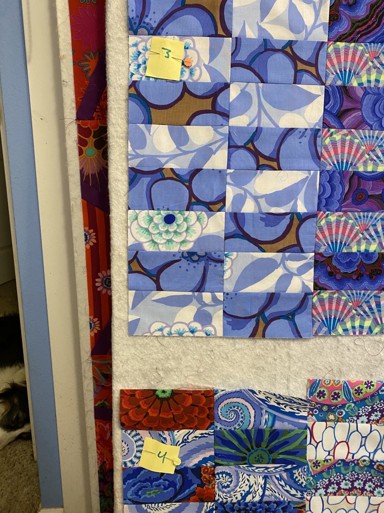 Over the years I’ve developed some tricks that help me keep my blocks and rows in order as I assemble my quilt top. First is that I mark the left most block of each row with a number.