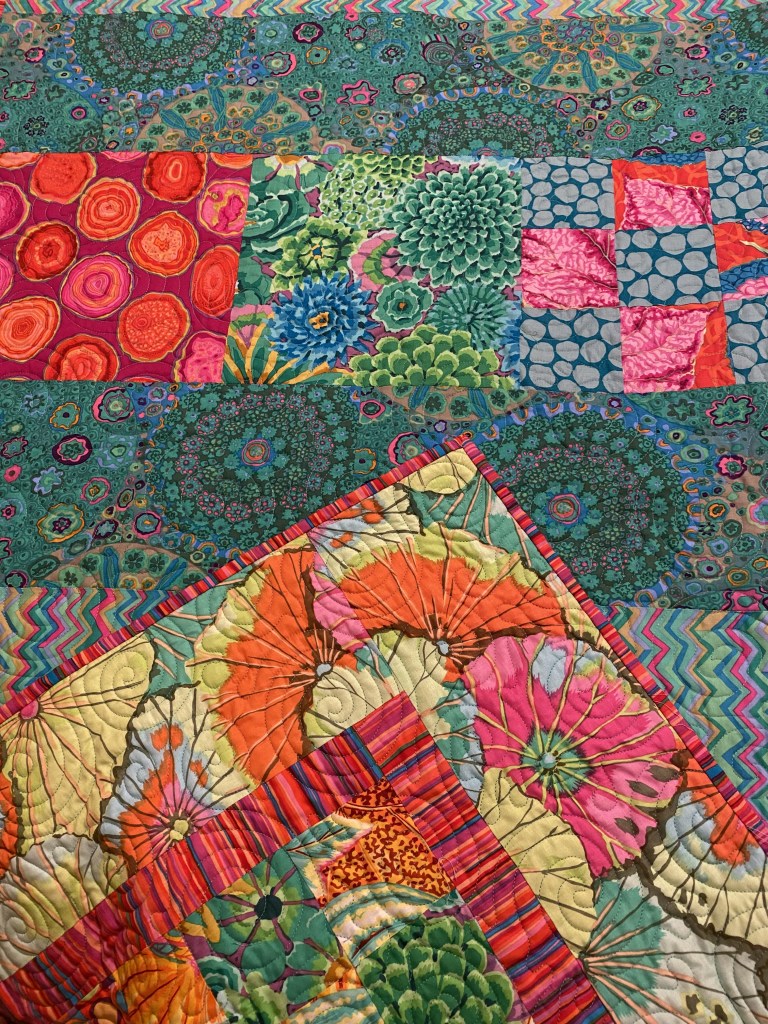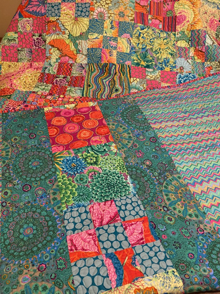 The quilts received back from your longarmer are just wonderful! What a wonderful array of colorful fabrics. I especially love your new quilt for your bedroom. The expression “let the fabric do the work” comes to mind. The pattern is so simple, but those Kaffe fabrics make it so special. I think I need to make myself something similar, but much smaller as I sleep in my recliner now. Can’t wait to see larger pix of the quilts.