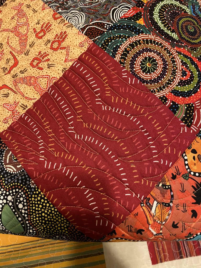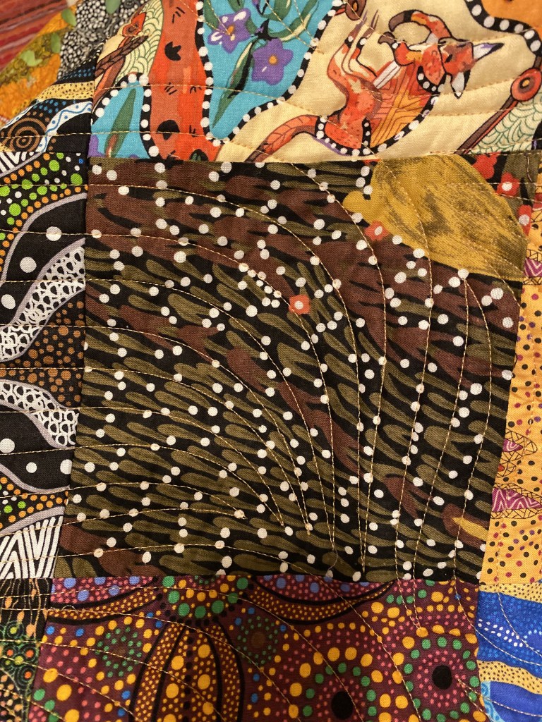The aborigional fabrics are so unique. love the zebra stripe on the binding.
