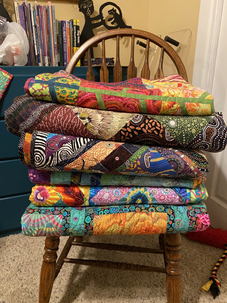 What a gorgeous, colorful quilt. To me, it screams HAPPY!!! Thank you for continuing to share your creations with us. Your friend’s quits are beautiful, too. The stack of finished quilts is impressive.