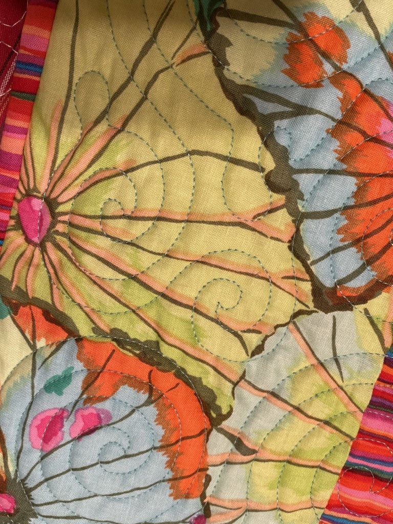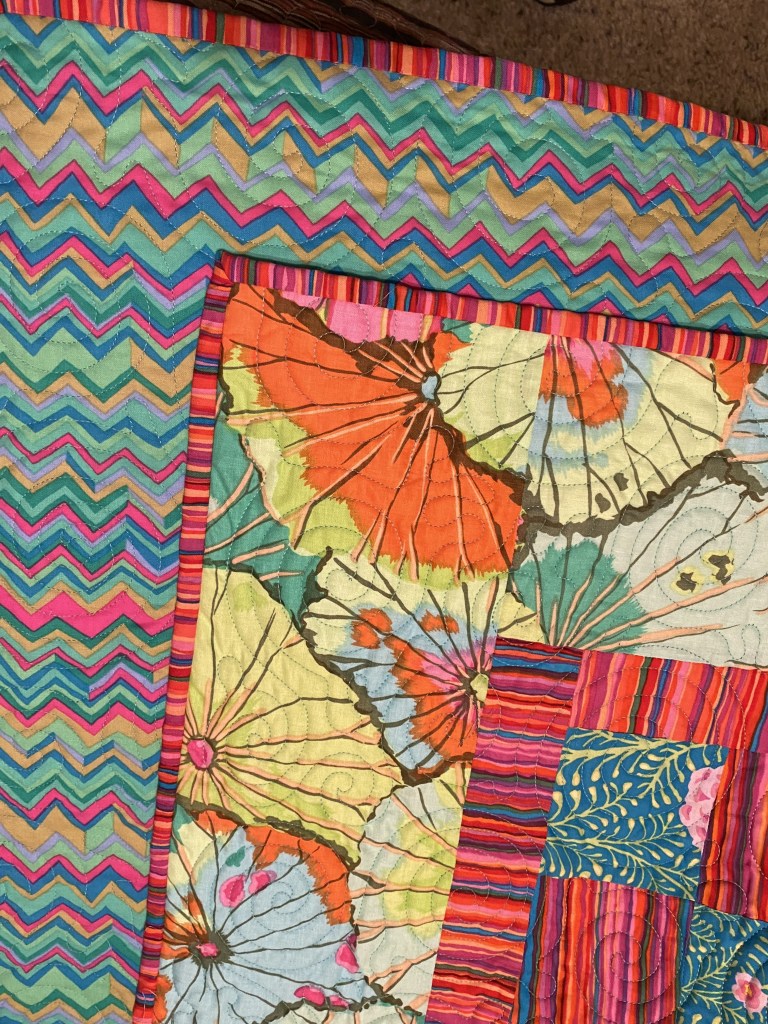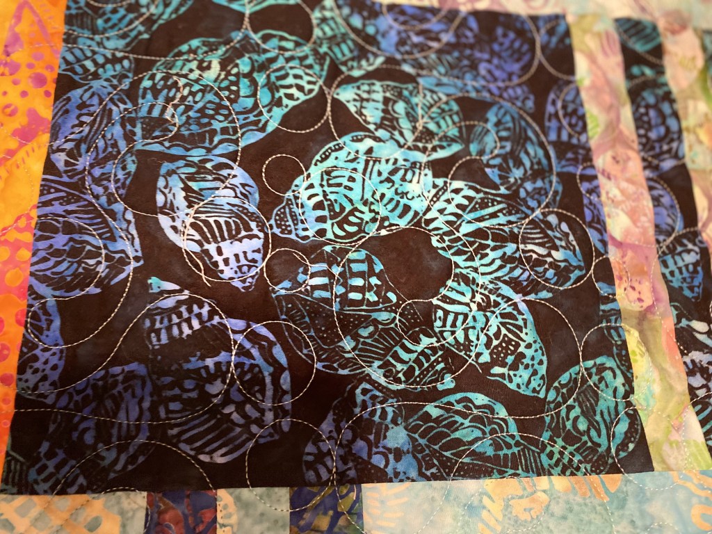 Wowzer! that first quilt design looks like “Time Warp”–I have used it twice on bargello quilts, and it is amazing! Looks terrific here. I don’t recognize the design with the circles and amoeba-like shape, but it works just as well on that quilt. Oh–finishes!!! so very satisfying.