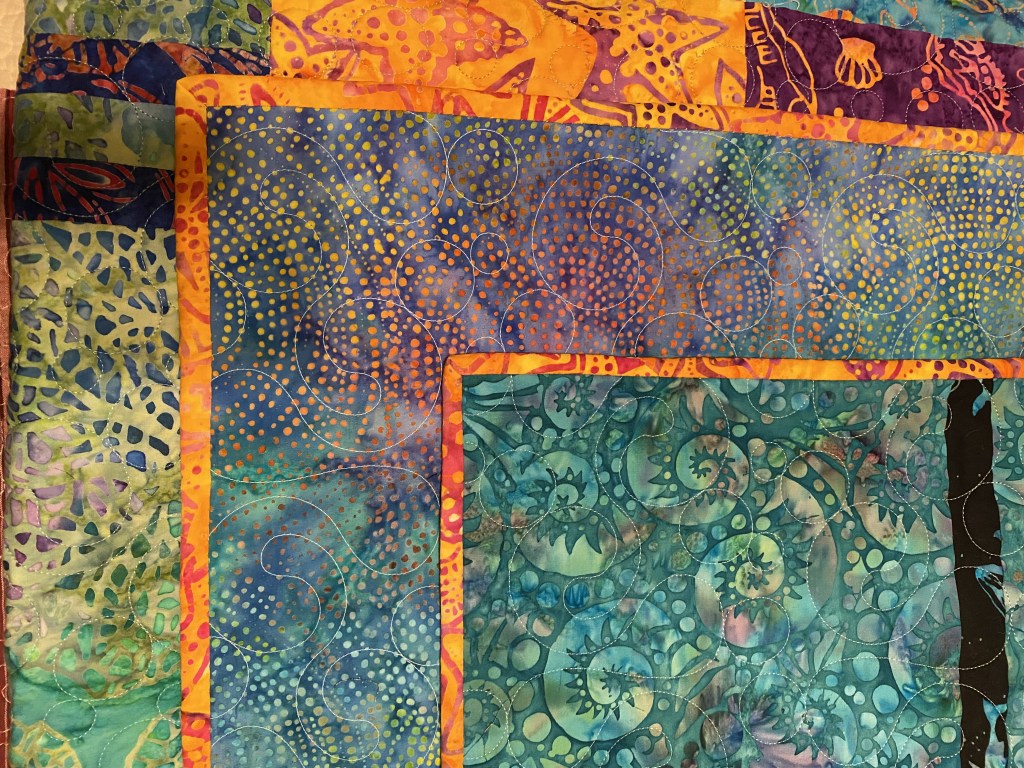 My favorite of my friend’s quilts is the second one from the top. It’s all Australian Aboriginal fabrics six inch squares set on point. It’s such a simple design but it’s absolutely gorgeous!!! And the quilting is perfect!