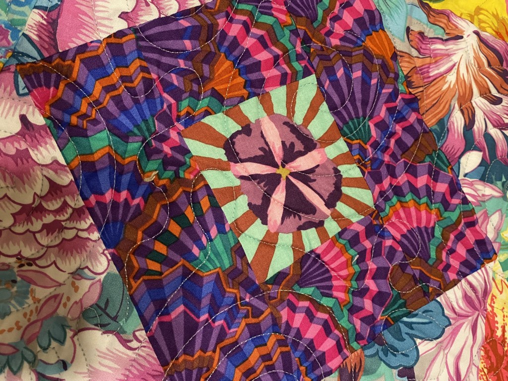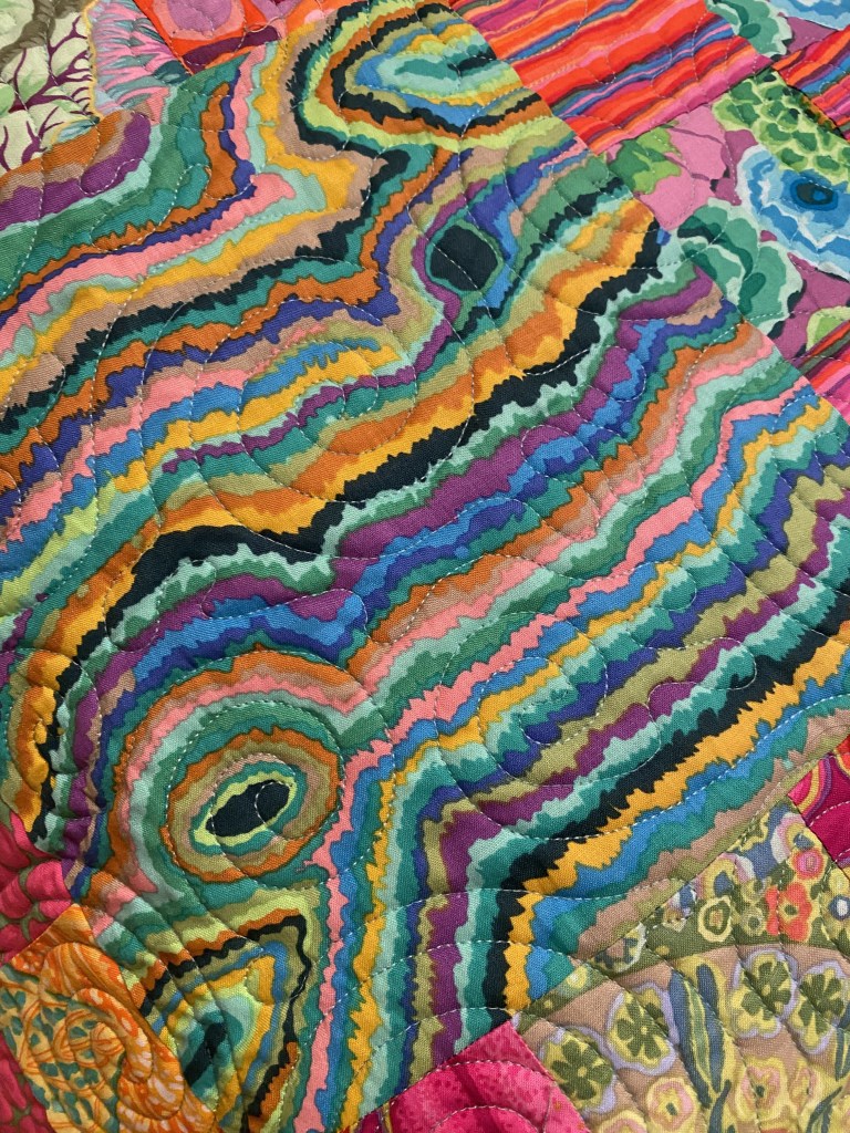 I can’t recall the name of that first quilt design. The long armer had a couple that were similar. But it’s kind of magic! I’m going to have her use that on my scrappy KFC trip quilt.