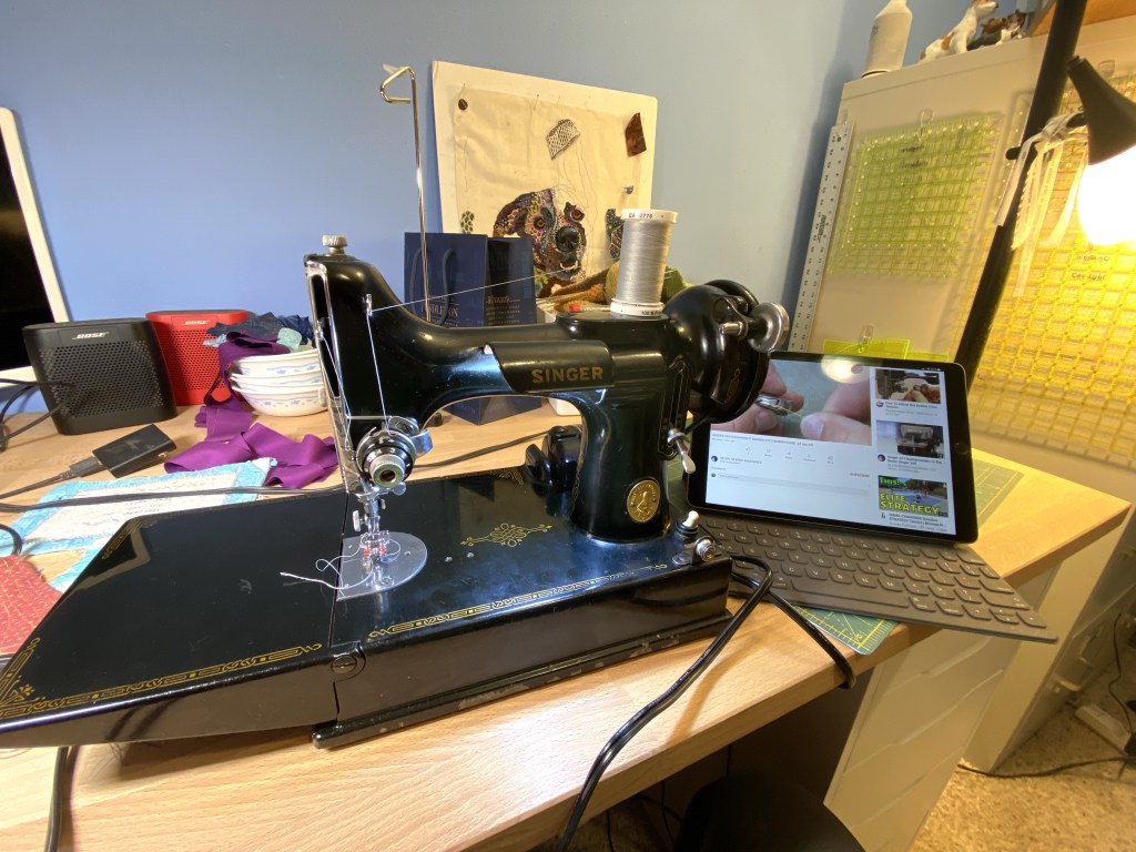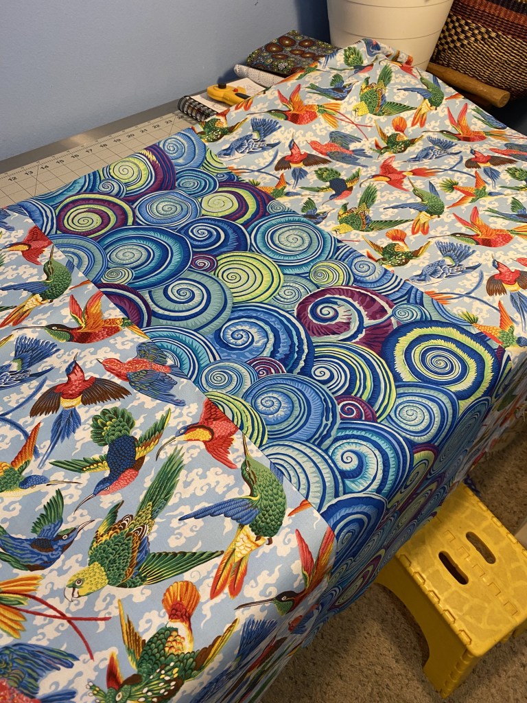 When I’m live on the air during fundraising I’m doing it through Zoom and I need to be hardwired into my internet, rather than using wifi. So that means I have to be in my sewing room since that’s where my router is. So my sewing room is a bit of a makeshift radio studio right now. Rather than turning it back into a sewing studio and then having to turn it back into a radio studio for my 7 am on air shift tomorrow morning, I decided to use the cutting table, which means I don’t have to mess with the radio studio set up.