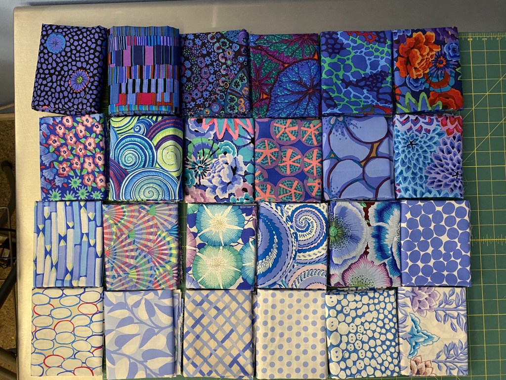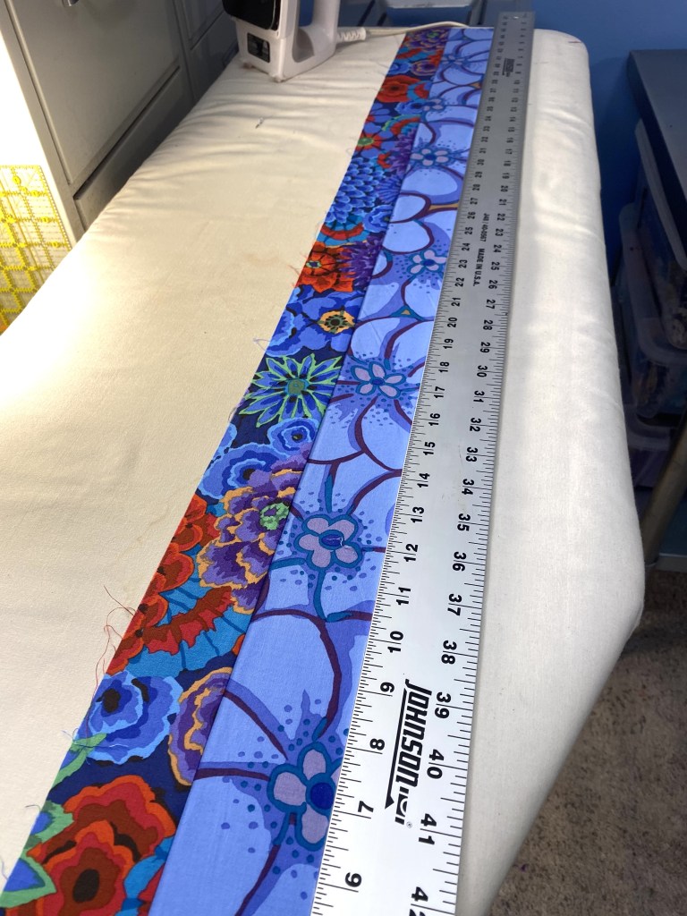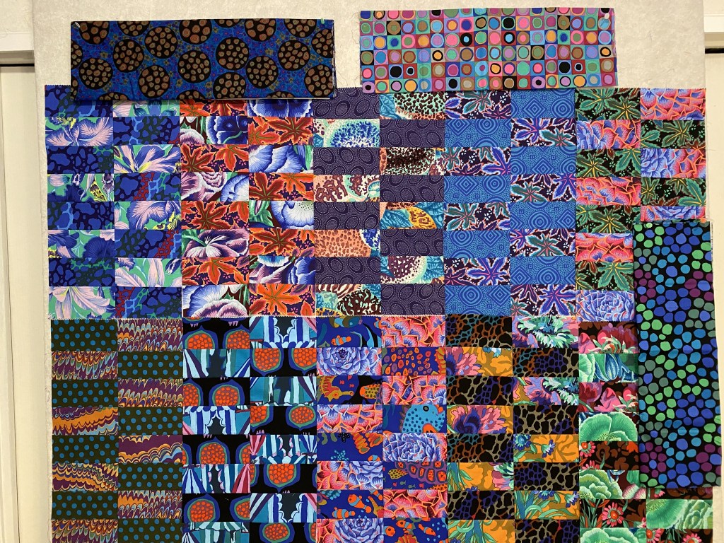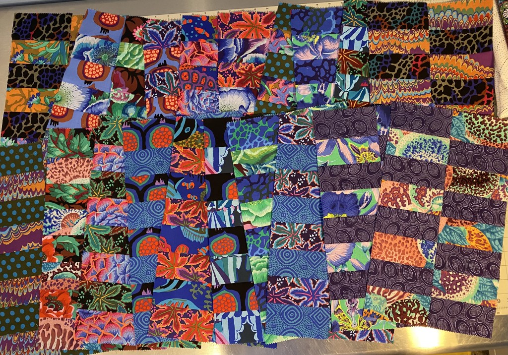 I managed to cut strips from all the “black” fabrics and the purple fabrics.