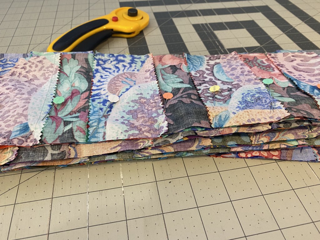 I cut two strips from each fabric. I’m going to need 60 strips for the size quilt I want to make so 11 of these fabrics will appear twice in the quilt top.
