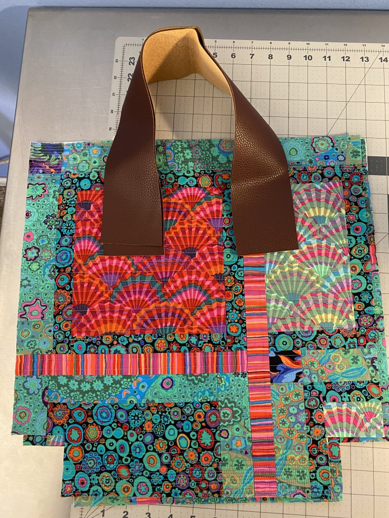 I got the handles made and the outer bag all sewn together. I decided to flip one of the panels because I really liked how the bottom of it finished up and I wanted it to show on the top of the bag.