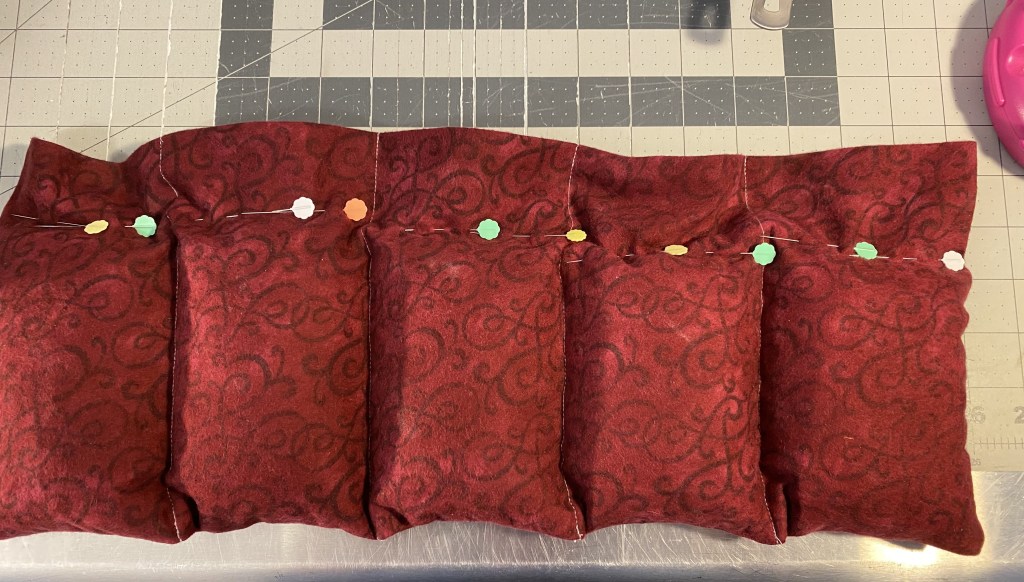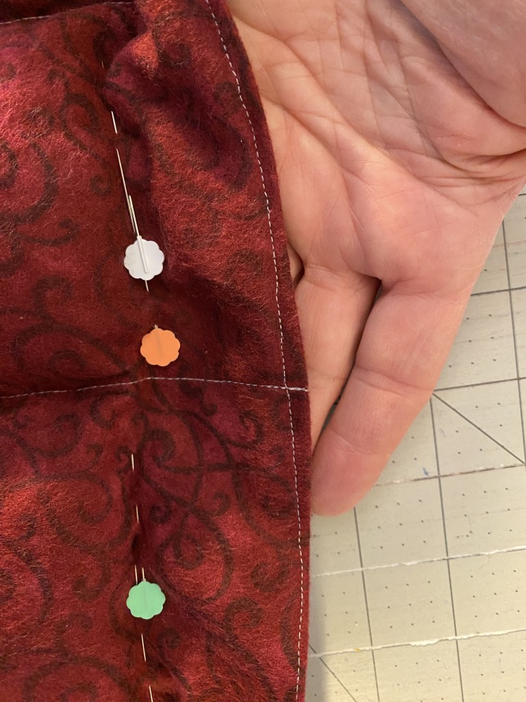 Once the corn is in the first section, hold up the bag so the corn falls to the bottom, away from the opening. Then put in a couple of pins horizontal to the opening to keep the corn away from the opening so you don’t sew over corn when you close this.