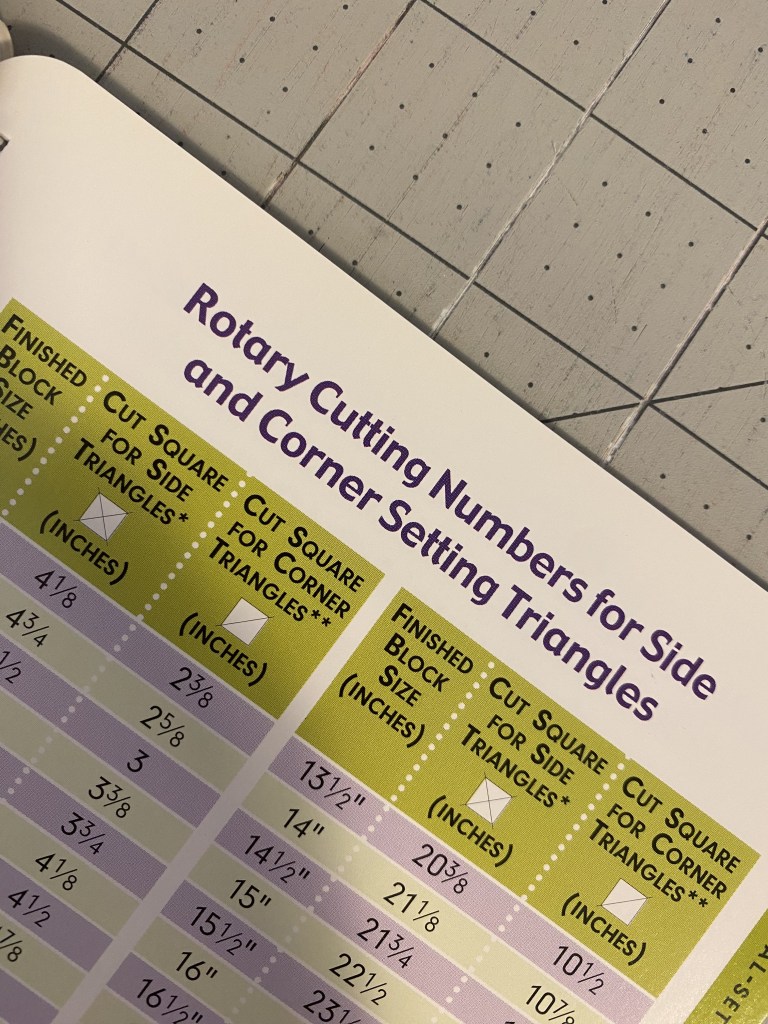 This is a great video but a little more than I felt prepared to wrap my head around this evening. So I grabbed my Quilters Reference Guide and pulled some fabric out of a box I’ve been filling for Good Will. I selected the right measurements for my triangles based on my finished block size. Then got to cutting.