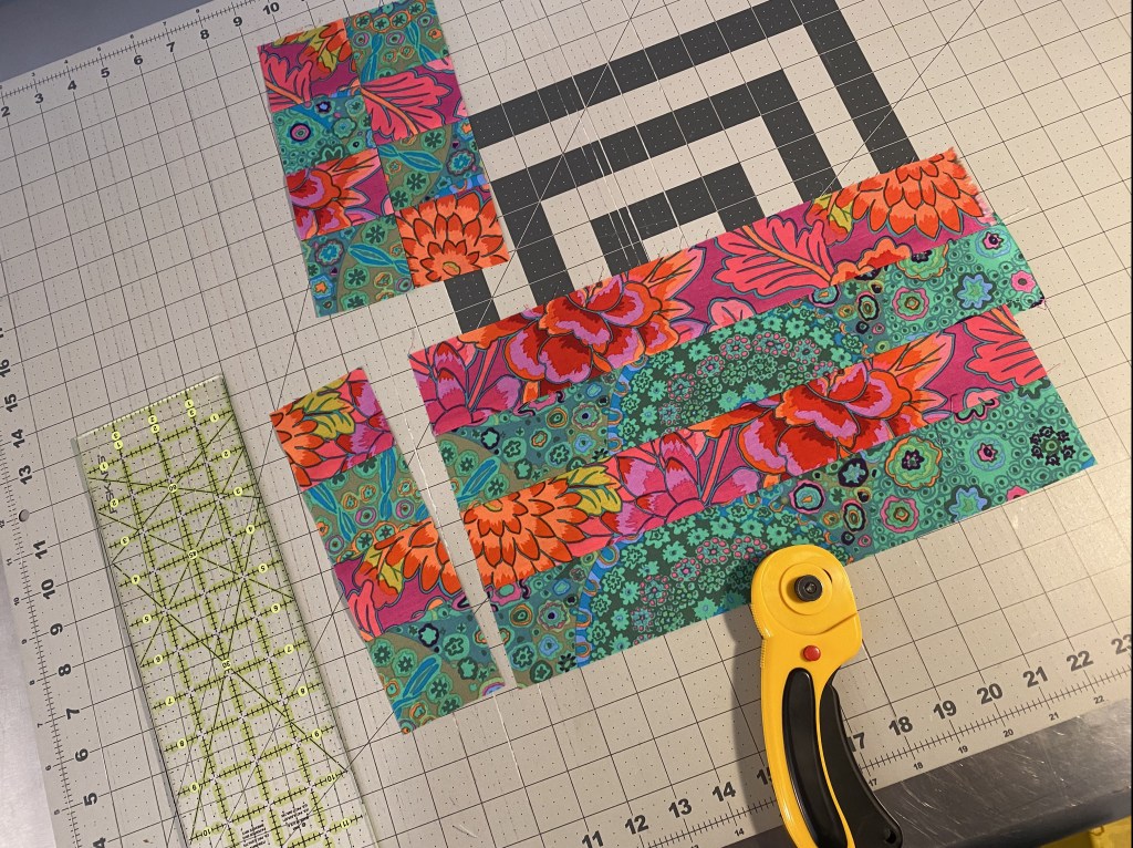 Then I cut some pink squares and bordered them with black and then cut them into quarters and put them back together in a strip.