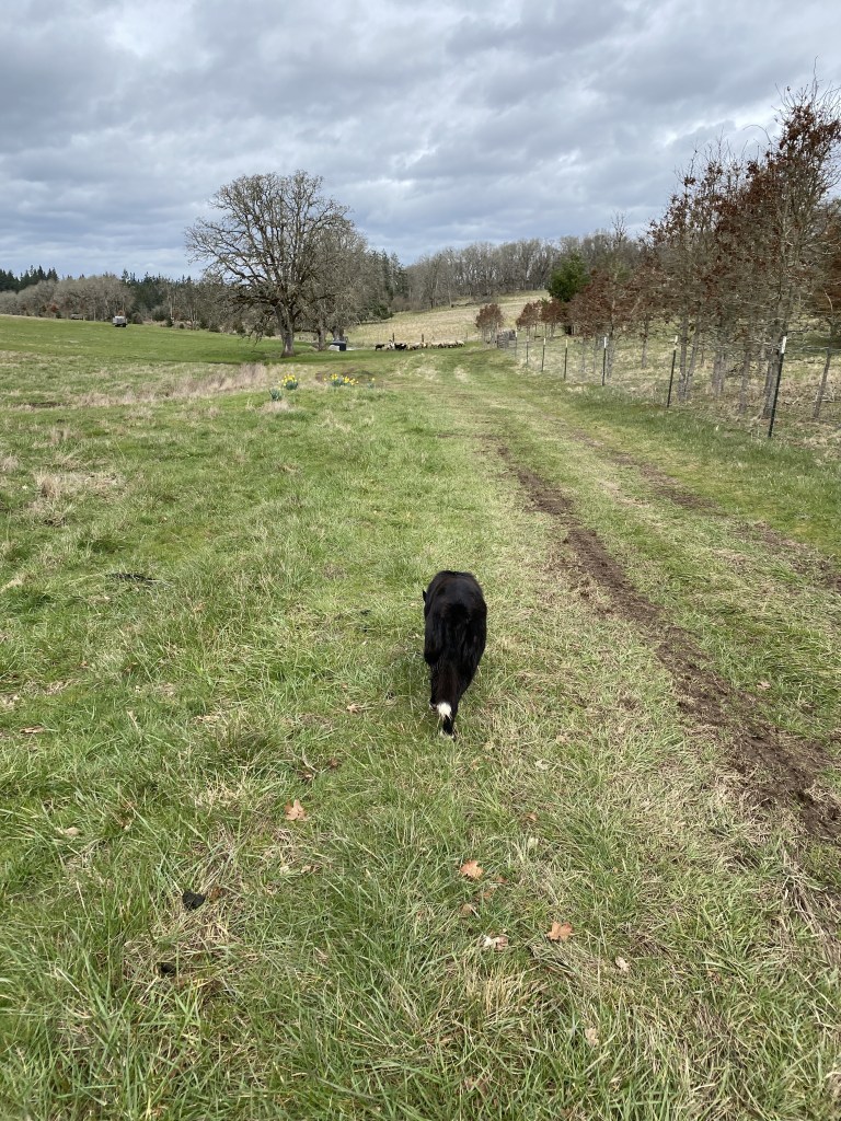 Those sheep are crafty and knew exactly where they were going and were already at the gate by the time Rico and I had walked a few yards. Once we got closer to the sheep, I sent Rico on a come-by flank (clockwise from my side), had him lie down and stay so he could hold the sheep while I walked toward them to open the gate. He did his job beautifully and the sheep were trotting into the tall, delicious grass in no time.