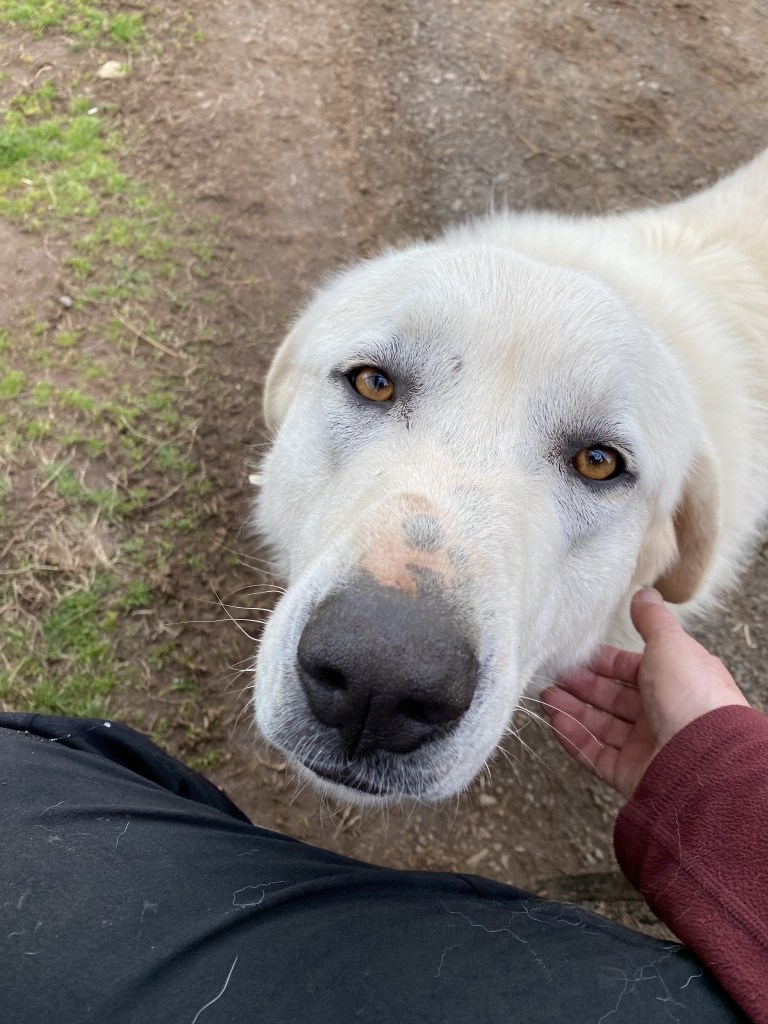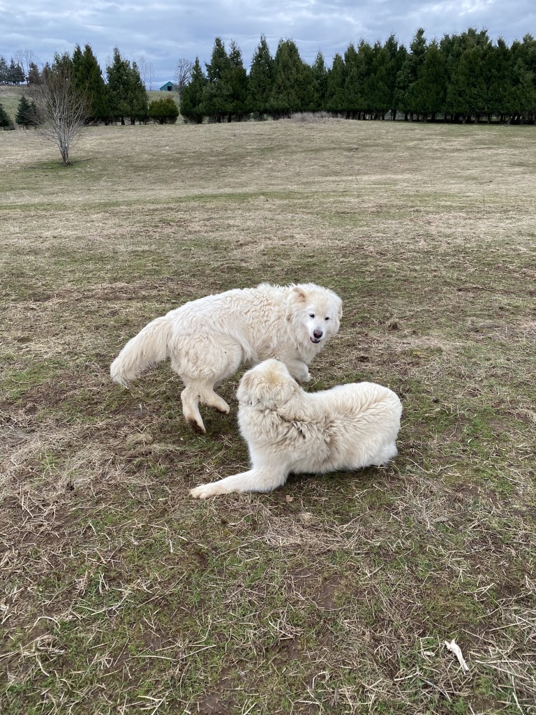 When we finished these morning chores we packed up some hay and grain and headed out to the back pasture to feed the pregnant ewes and see if any lambs had been born overnight. When we got to the gate there was no Regina — one of the guard dogs. We took this as a good sign that she was out in the trees keeping a watchful eye on lambs.