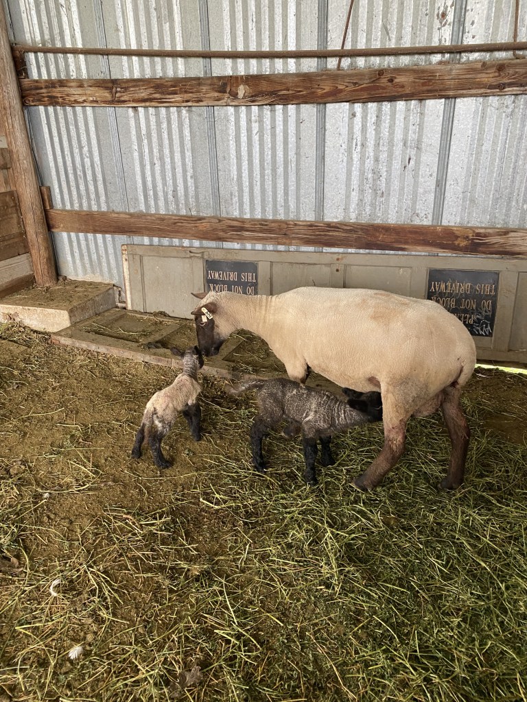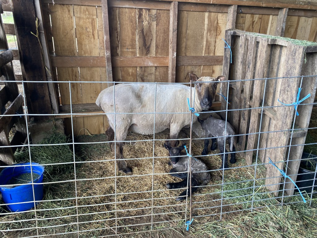 In this next photo, the cheviot cross is closest to Trudy with the white lamb. The clun is further off to the left of the photo.