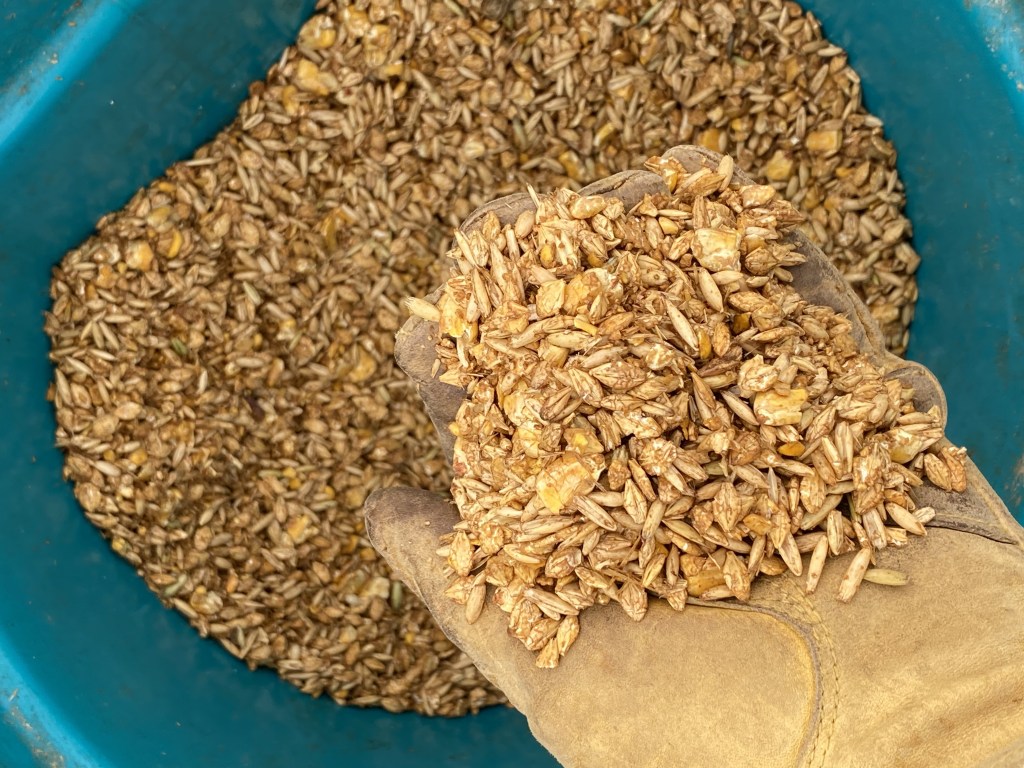 First thing we did was get busy feeding the ewes around the barn. I dug in and gave everyone in the barn a nice helping of grain — a mix of different grains with a little molasses mixed in. It looks and smells like granola and the sheep love it.