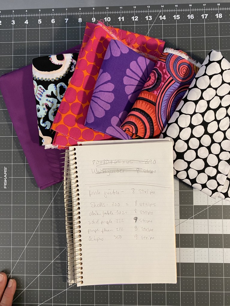 I had made notes on the size of each quilt top so All I had to do was calculate the total inches of the outside edges and divide by 42 to figure out how many strips of fabric I need for each quilt.