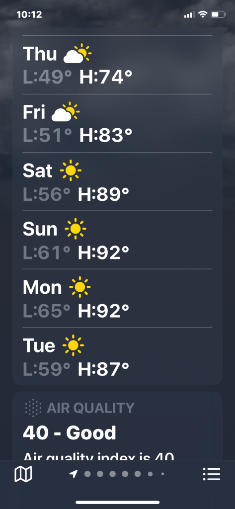 Your weather this week will mirror ours down here in SC. The difference is we’ll have that ALL summer🫤! Enjoy your days off!