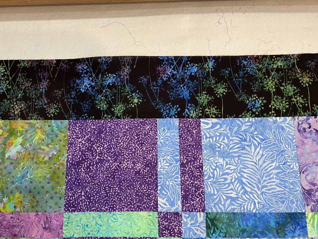 We chose the same fabric that we used on the back of her quilt, and combined it with the fabrics I used for the sashing and corner stones. I had these two fabrics in my stash.