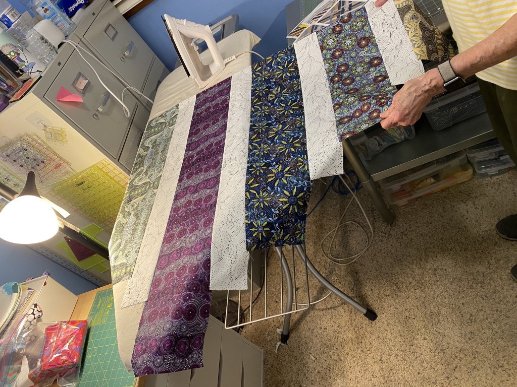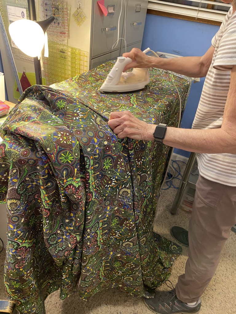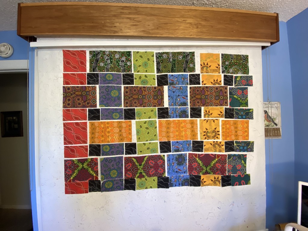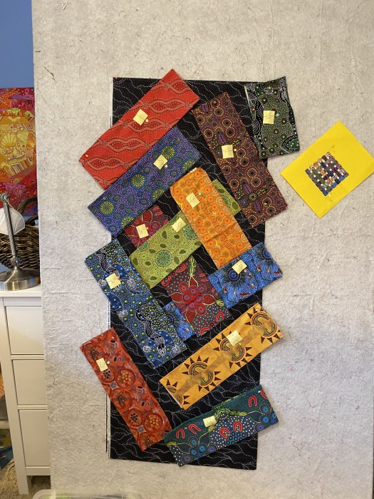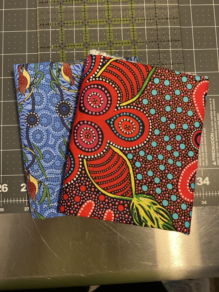 My sister in law, the one I made this Aboriginal quilt for, was in town today. When I was at her and my brother’s place a couple weeks ago she decided she wanted me to make some pillow cases to go with the quilt. So today we visited my local quilt shop that has a nice selection of those fabrics and chose a piece for the main part of her pillow cases.