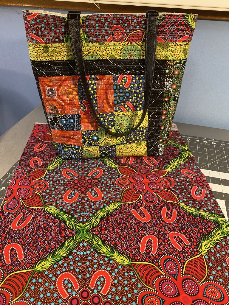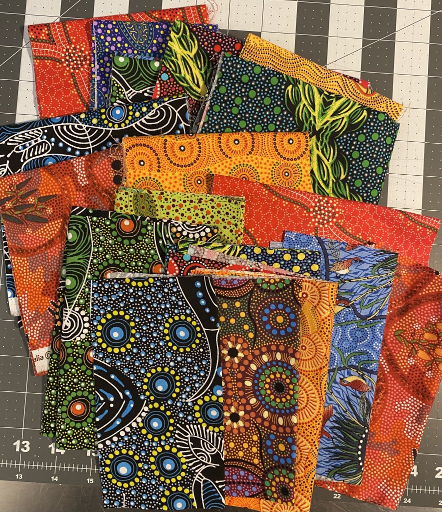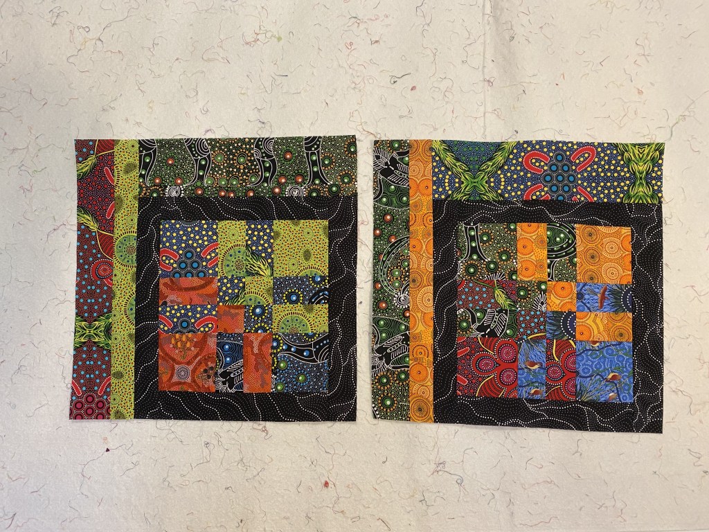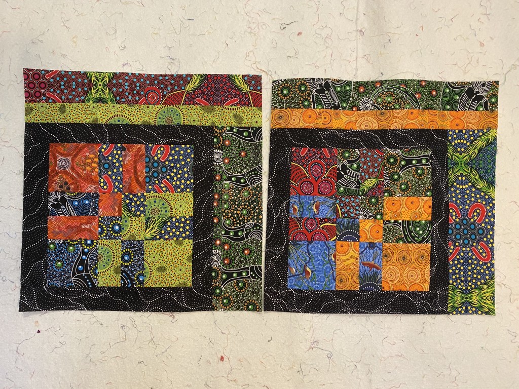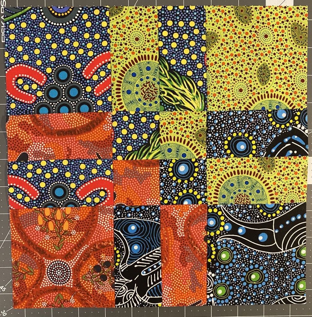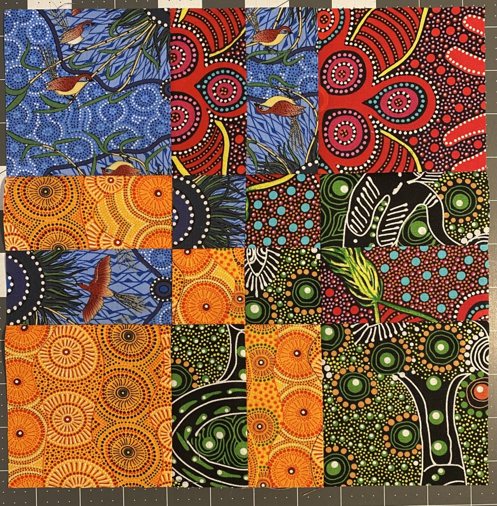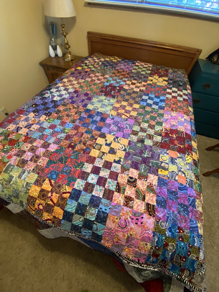 First off is this Australian Aboriginal fabric sixteen patch quilt that we made when my friend was here in March. I love this one!