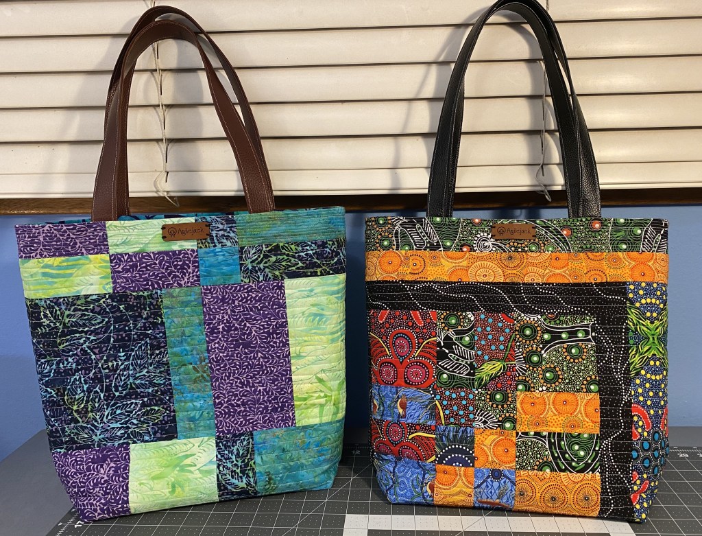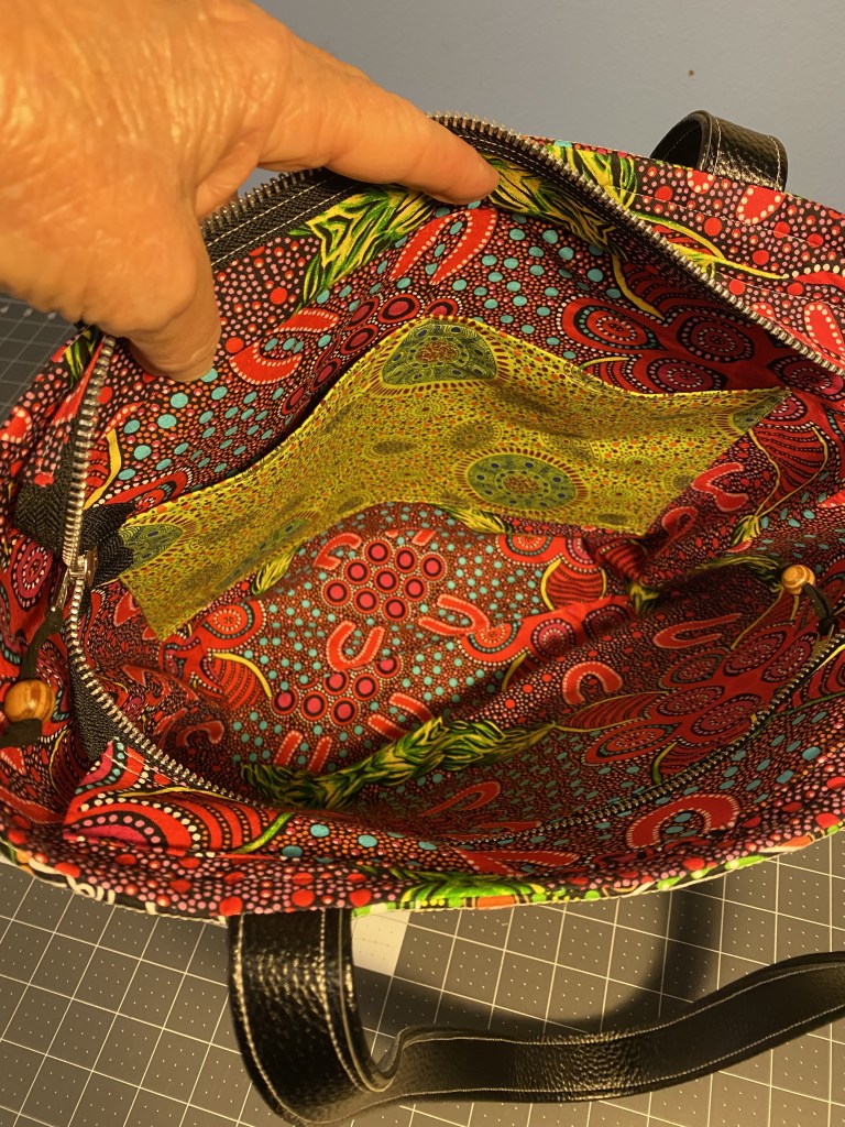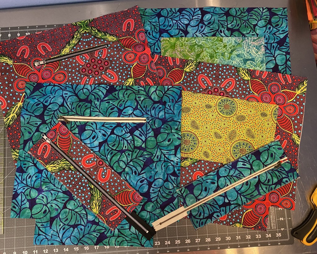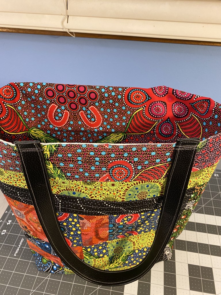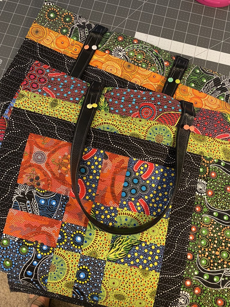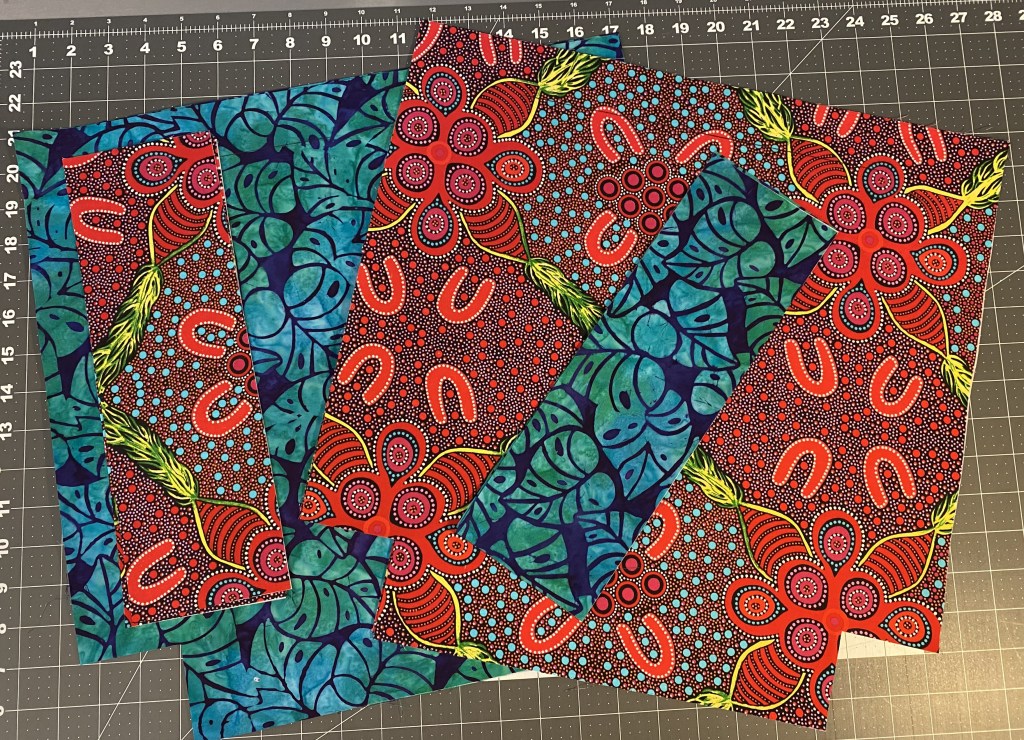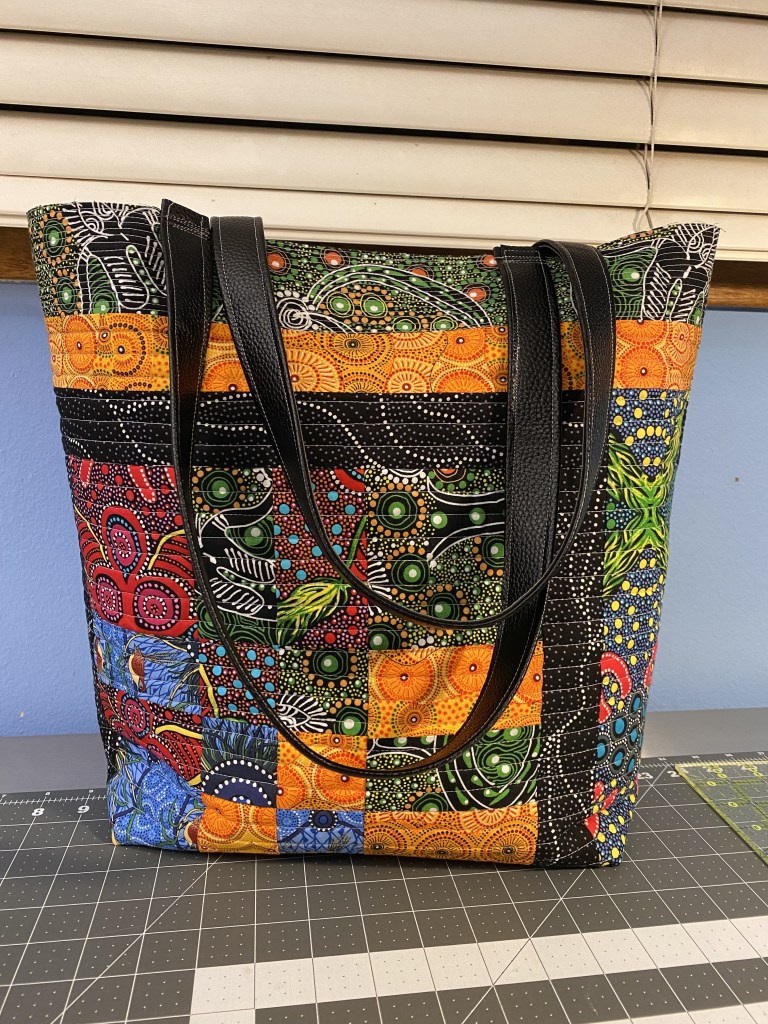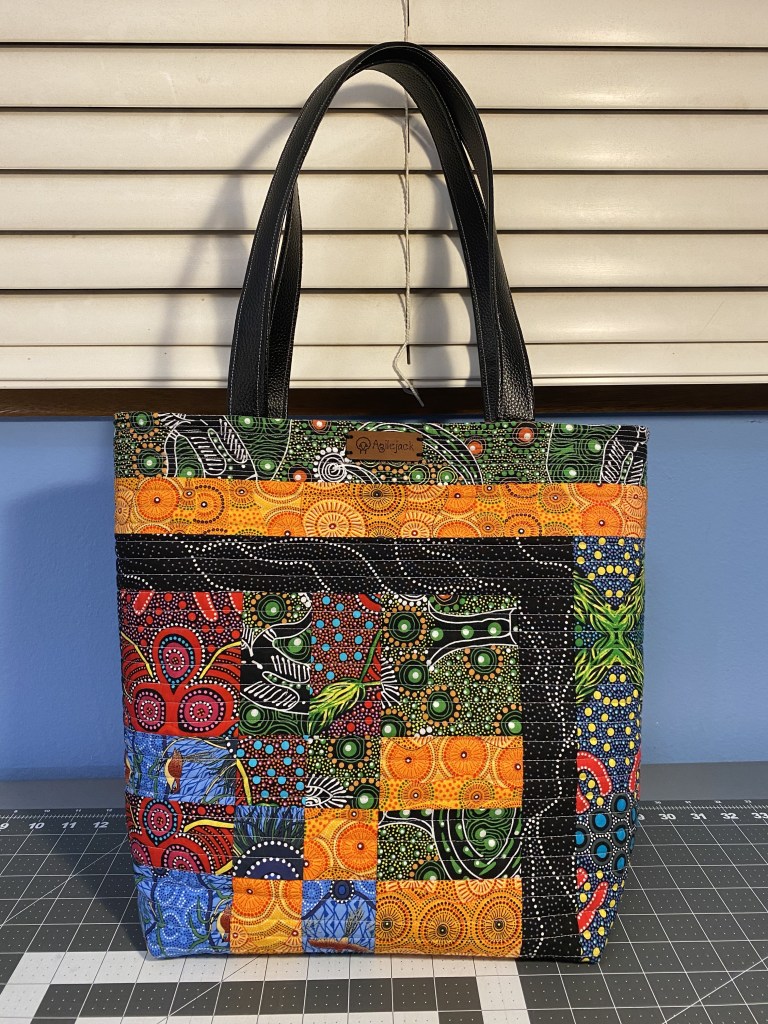 First off is this Australian Aboriginal fabric sixteen patch quilt that we made when my friend was here in March. I love this one!