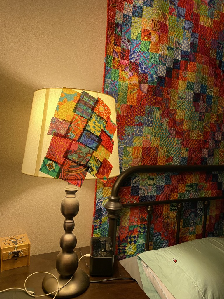 In about an hour I had all the little fabric pieces adhered to the shade and then went over the whole thing with a coat of the Fabric Mod Podge.