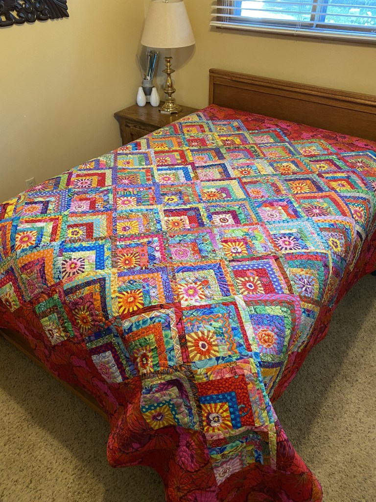 I’m really happy with how my quarter log cabin quilt turned out! I just love how a quilt top is transformed when it’s quilted and bound. And this one is a real beauty! And it only took three years from start to finish!
