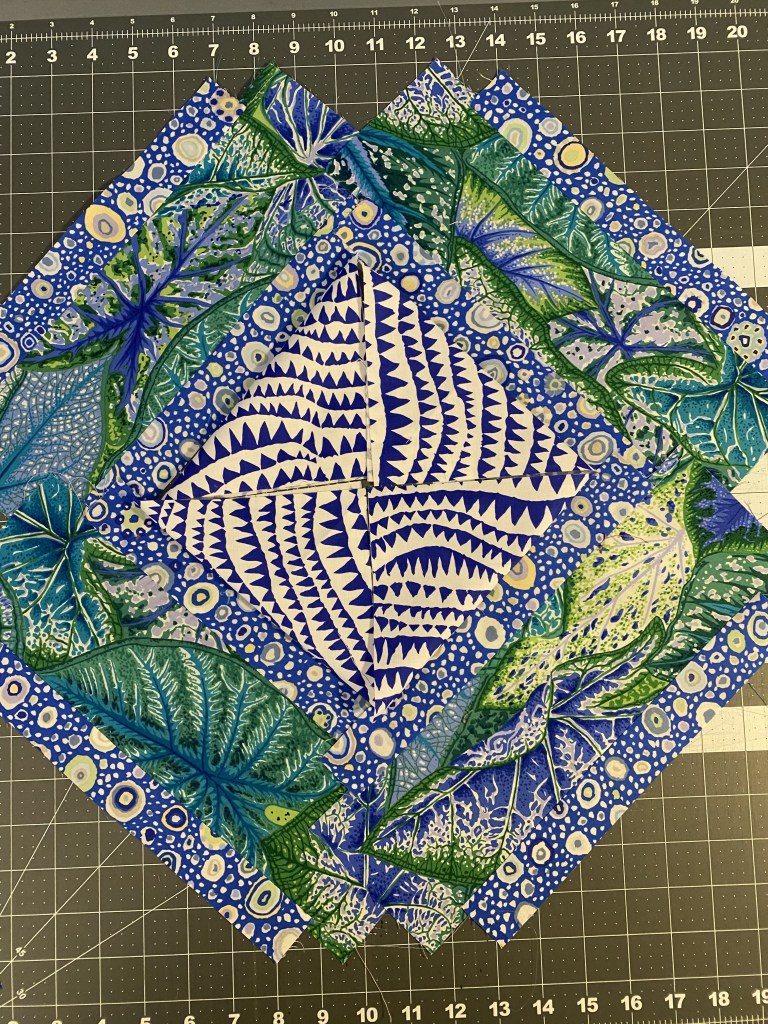 I had planned to use the royal blue Roman glass as the border on the Jewel Frames block with the blue and white sharks tooth as the wider sashing. For this block I’m using the roman glass as the strips along the center of the block and the sharks tooth for the corner triangles of each block.