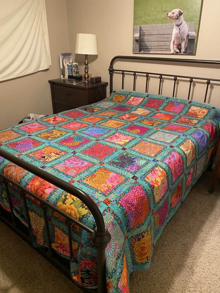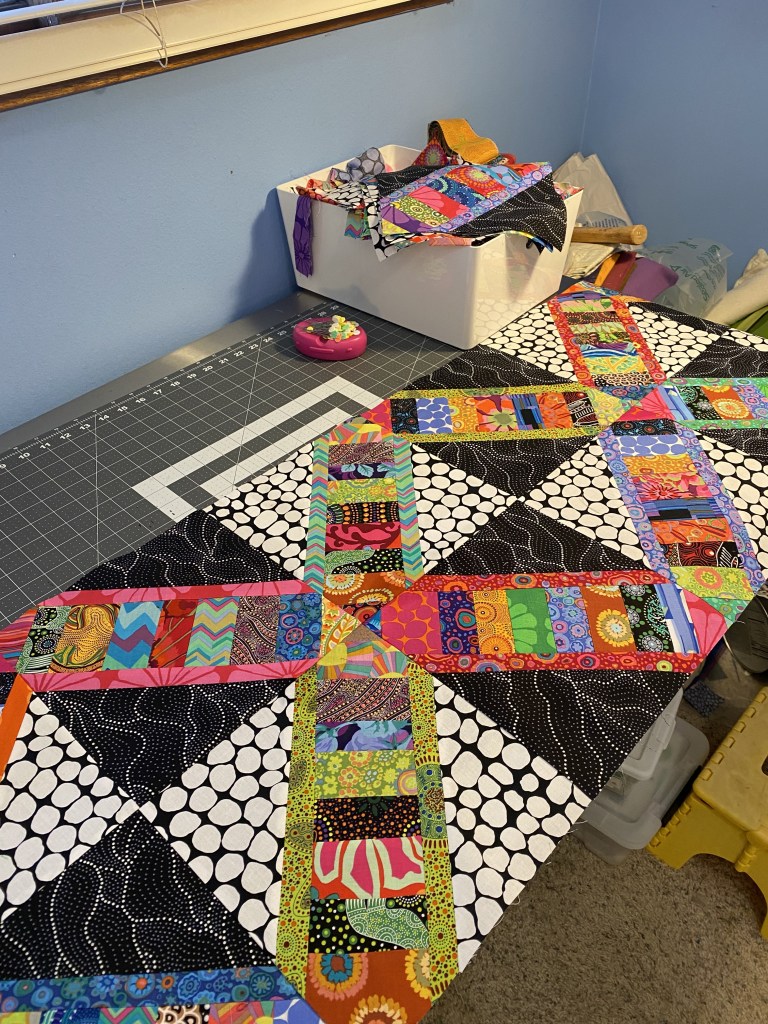 When it was all done and pressed I was going to put it back up on the design wall to take a photo and decided to go ahead and sew a line of stitching all the way around the edge to keep the bias edges of the corners of those blocks from getting all wonky.