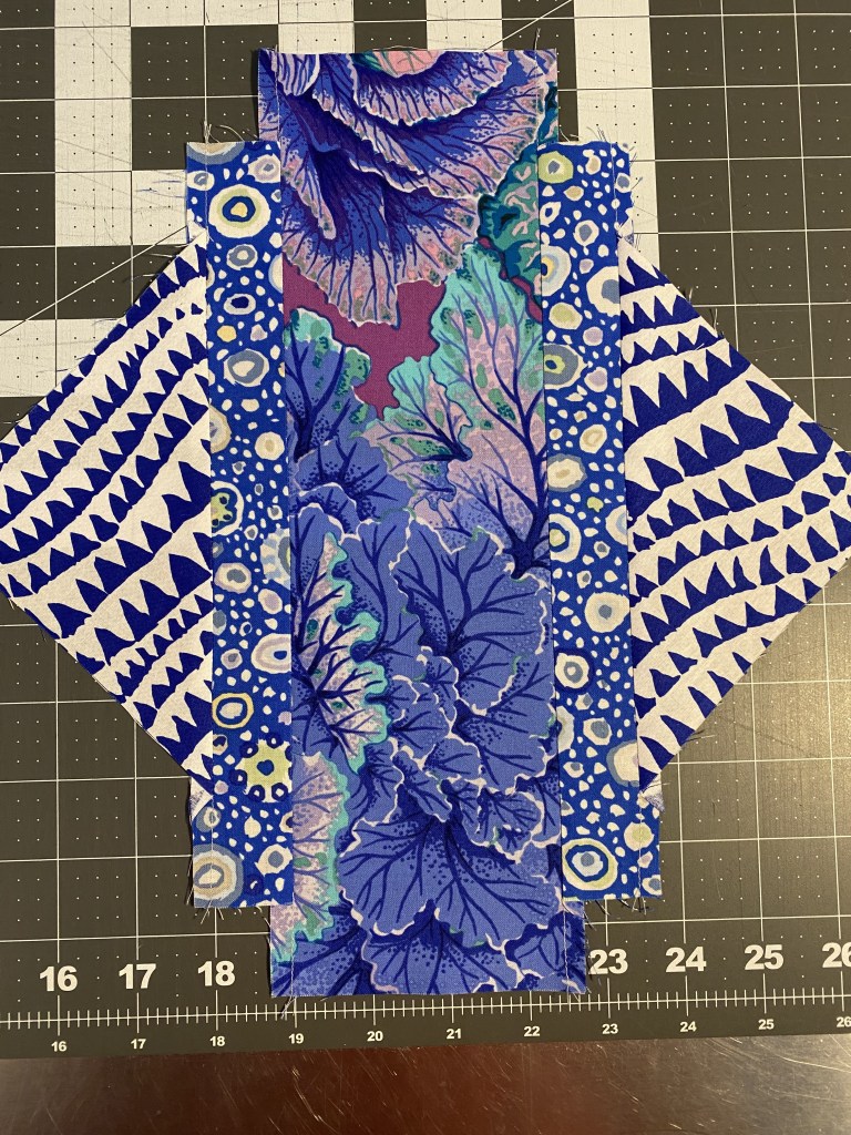 It goes together in exactly the same way as my Fresh Start blocks. but everything is a little different in size. I cut the center strip from one piece of fabric rather than piecing it. And I cut it 4 inches wide rather than 3.5 inches wide. I cut the strips on either side at 1.5 inches and didn’t trim the strip before adding the triangle. And it worked well.