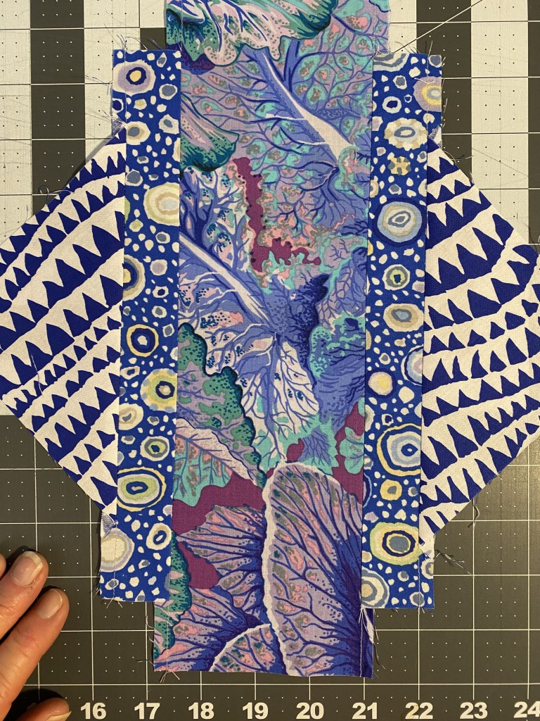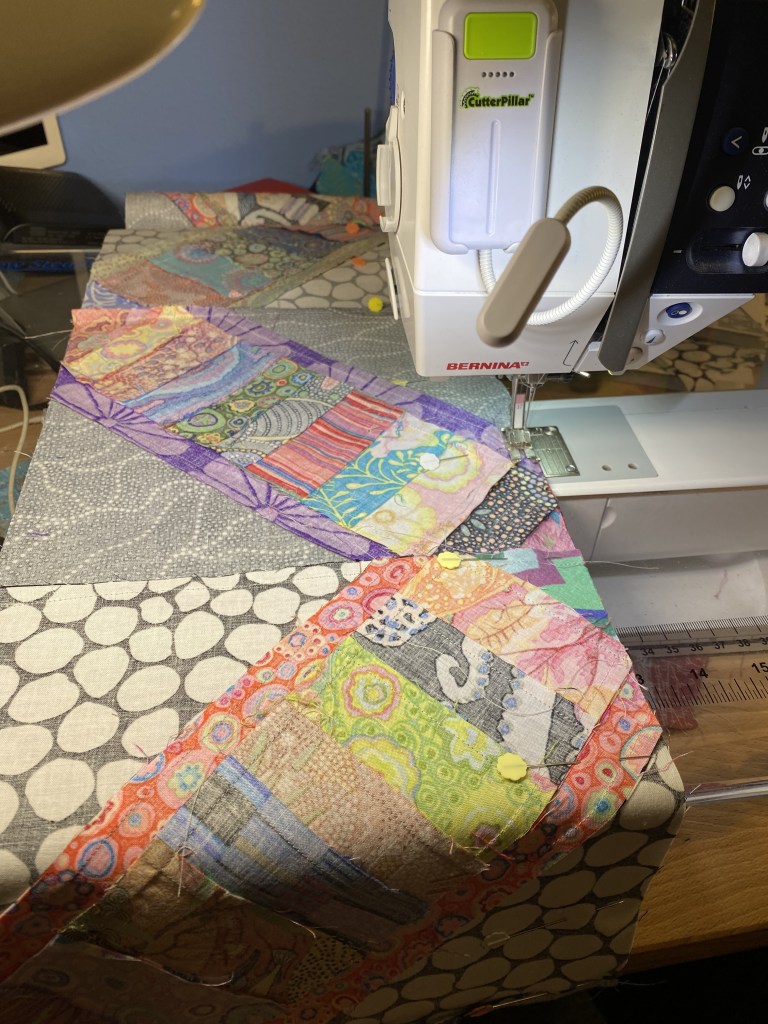 I’m really liking how this is looking. And it should just get more and more interesting with every additional fabric design I add. I really love the effect of that sharks tooth were those corner pieces come together.