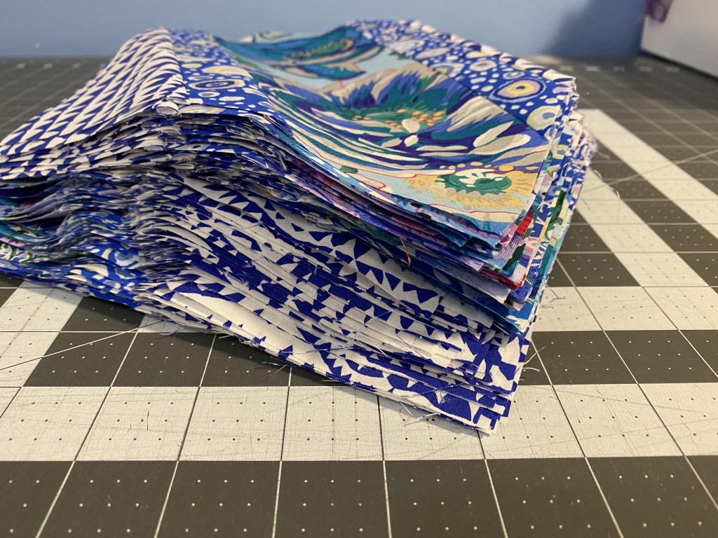 There are fifteen finished blocks in that bin and a bunch of strip tubes that have been cut into pieces and are ready to sew together.