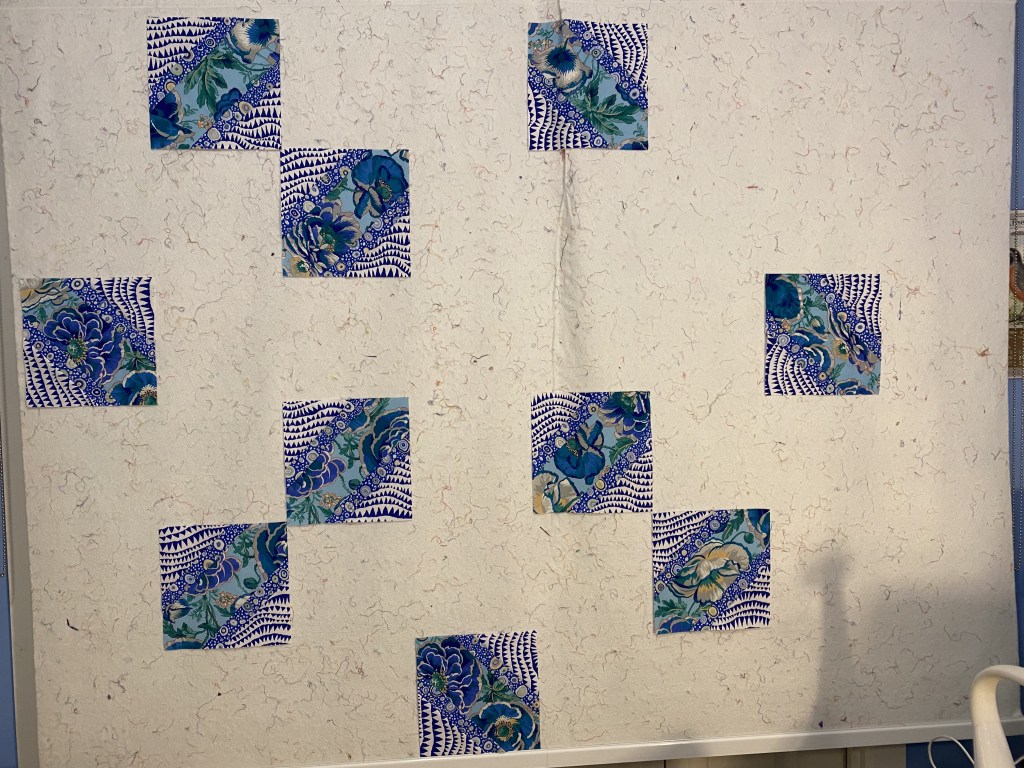 I picked up my blue blocks and started putting them on the design wall. I thought I’d do a few rows, but no. I put all 80 blocks up on the design wall. And then I called it quits.
