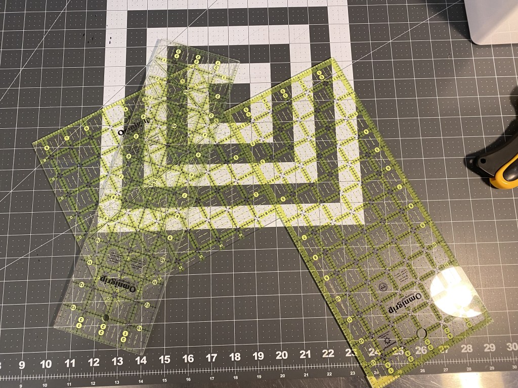 These three rulers allowed me to determine the size of the block, the size of the center strip and the size of the corner triangles.
