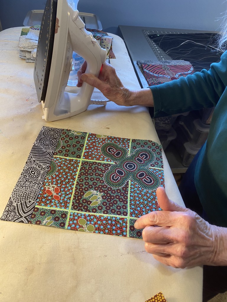 Cutting corner squares into triangles: Critical to maintaining swirling effect where blocks meet.