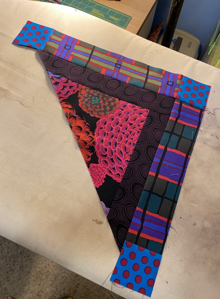 Center sharks teeth triangles on each side of the center strips with sashing. Pin and sew being careful to not stretch the cut bias edge of the triangle. Press seam allowances toward the sharks teeth.