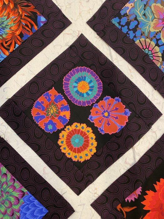 Since color ways of sharks teeth are limited, try different fabric patterns for the corners that will give interesting swirly effects.